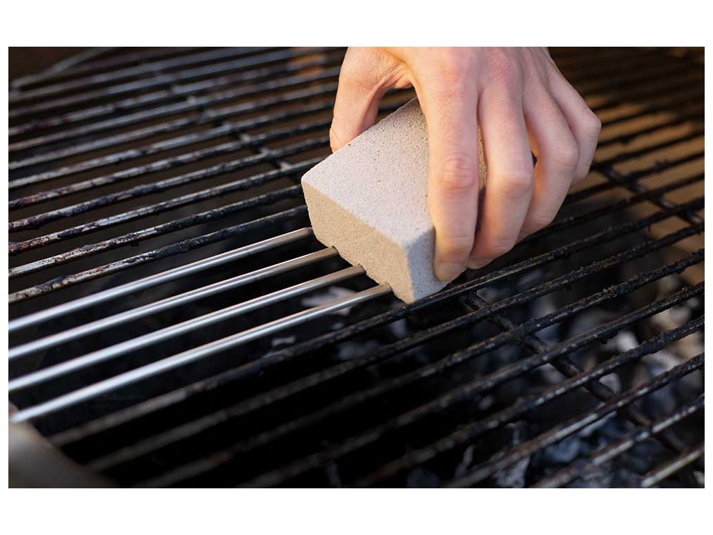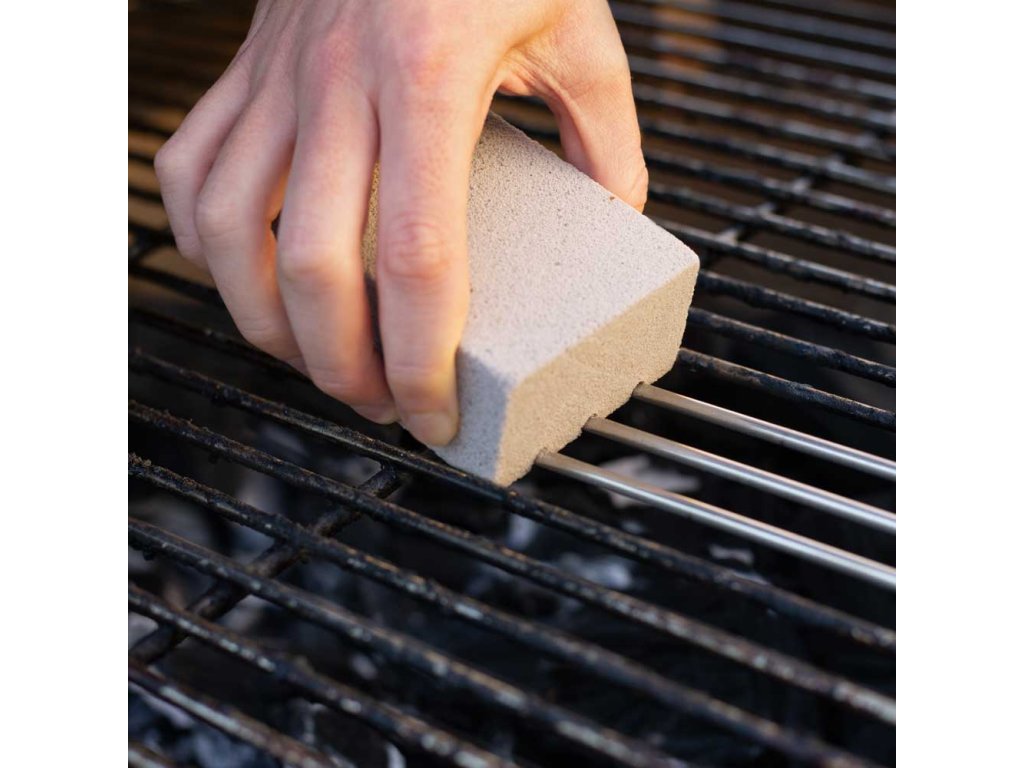 Aplikace čistícího kameneAplikace je neuvěřitelně snadná. Vyjměte rošt z grilu a položte jej na podložku. Poté lehkým až středním tlakem přetřete briketu přes vzpěry roštu. Po vyčištění stačí rošt opláchnout dostatečným množstvím vody.