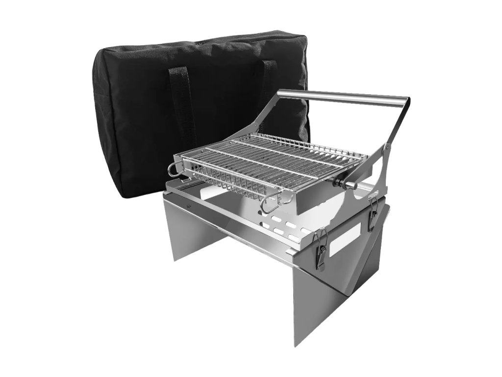 Tento kompaktní a praktický skládací gril z nerezové oceli je ideální volbou pro milovníky grilování na cestách. Díky skládací konstrukci je snadno přenosný, uložený v černé textilní tašce s uchem pro pohodlné přenášení.