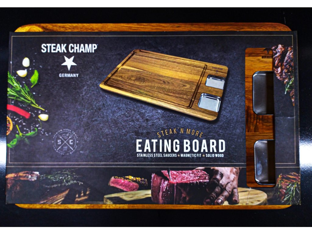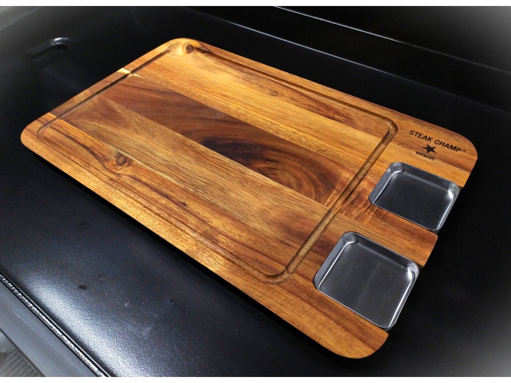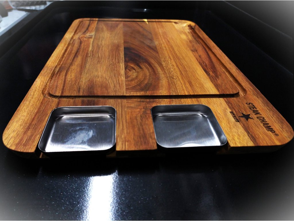 Servírujte své grilované dobroty stylově na servírovacím prkénku SteakChamp. Šťáva z masa vám nevyteče na stůl díky drážce po obvodu prkénka. Nerezové mističky, které jsou součástí prkénka, využijte na dipy či omáčky k namáčení masa a zeleniny.