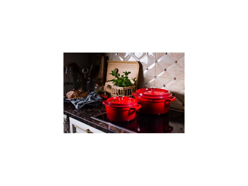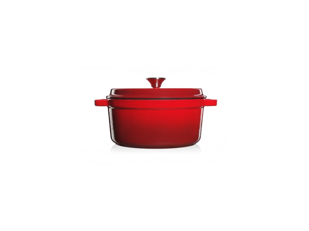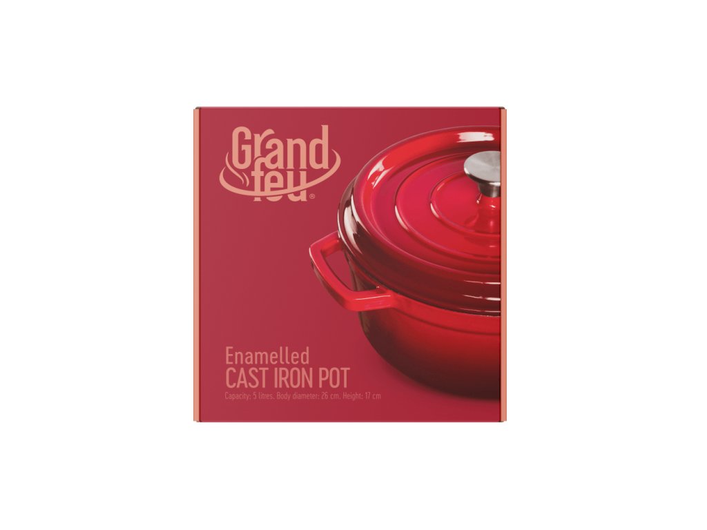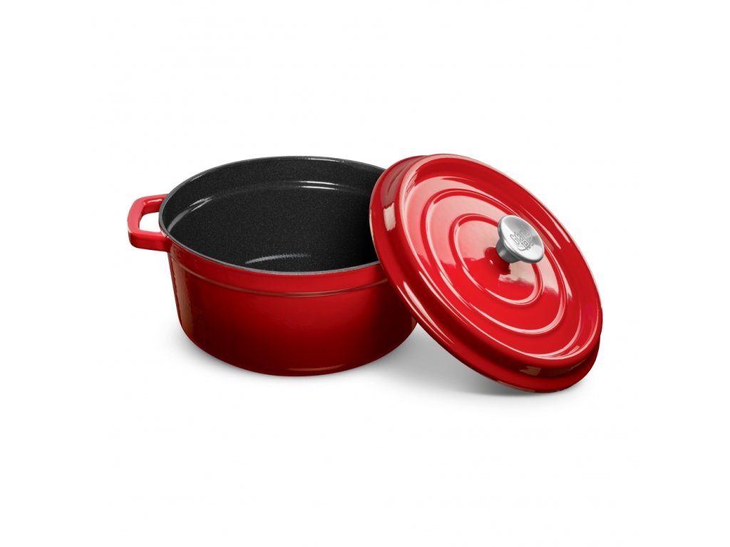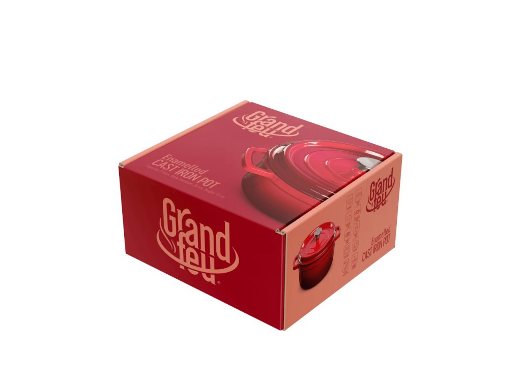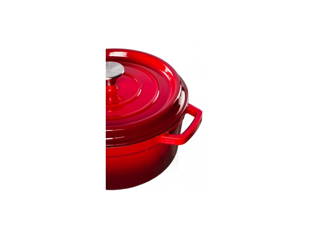 Stylový, minimalistický design červený Grand feu, 3,5 l, s víkem – záruka dlouhé životnosti a odolnosti. Tělo hrnce je vyrobeno z litiny, vnější strana je pokryta lesklým smaltem, vnitřek je pokryt matným smaltem. Matná smaltovaná vrstva chrání vnitřní povrch před rzí a zároveň zajišťuje, že se vařené jídlo nelepí na okraje.