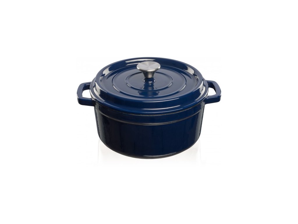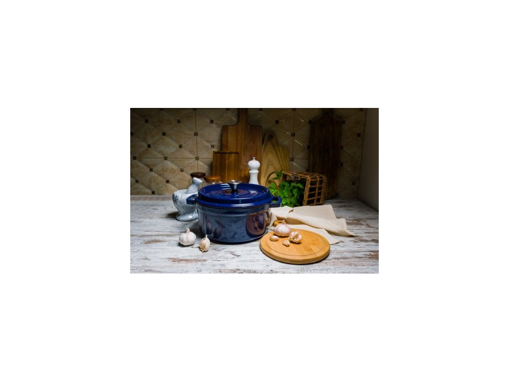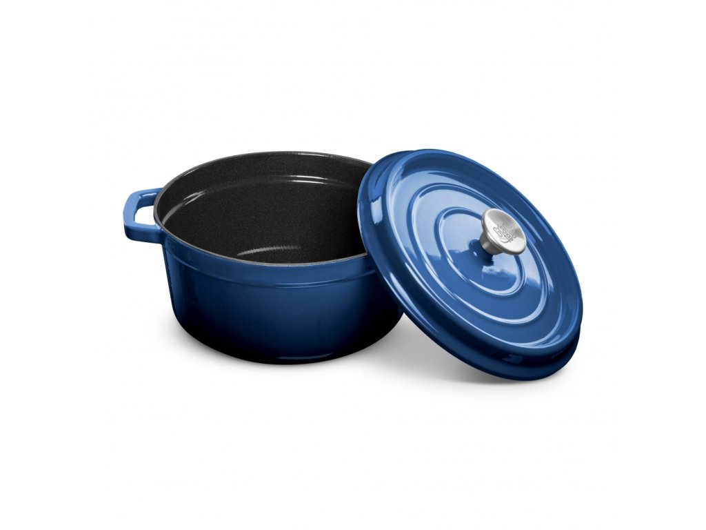 Stylový, minimalistický design tmavě modrý Grand feu, 3,5 l, s víkem – záruka dlouhé životnosti a odolnosti. Tělo hrnce je vyrobeno z litiny, vnější strana je pokryta lesklým smaltem, vnitřek je pokryt matným smaltem. Matná smaltovaná vrstva chrání vnitřní povrch před rzí a zároveň zajišťuje, že se vařené jídlo nelepí na okraje.
