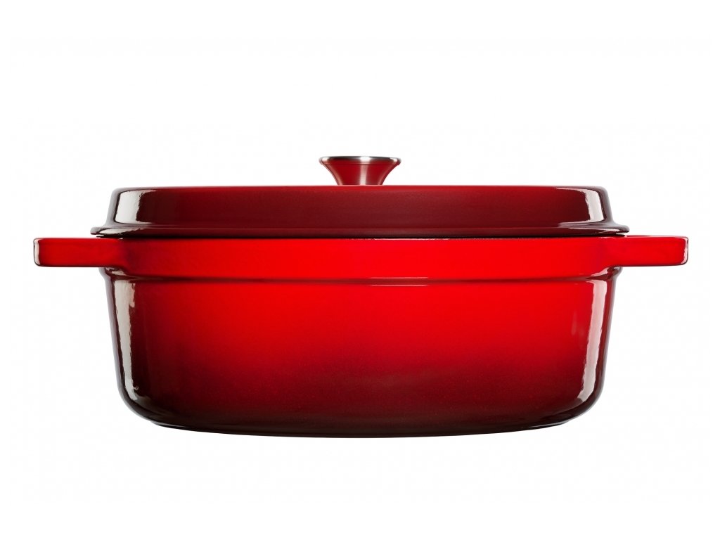 Stylový, minimalistický design červený Grand feu, 5,6 l, s víkem – záruka dlouhé životnosti a odolnosti. Tělo hrnce je vyrobeno z litiny, vnější strana je pokryta lesklým smaltem, vnitřek je pokryt matným smaltem. Matná smaltovaná vrstva chrání vnitřní povrch před rzí a zároveň zajišťuje, že se vařené jídlo nepřichytává k okrajům.