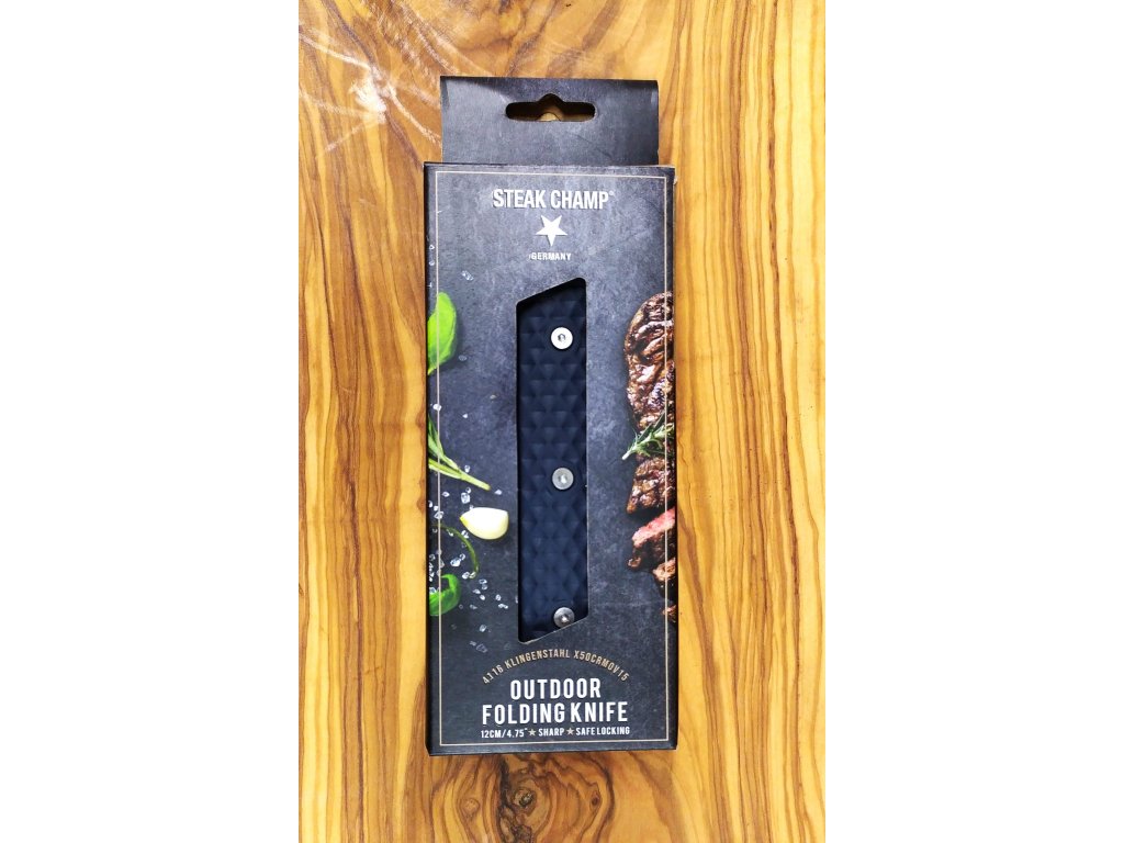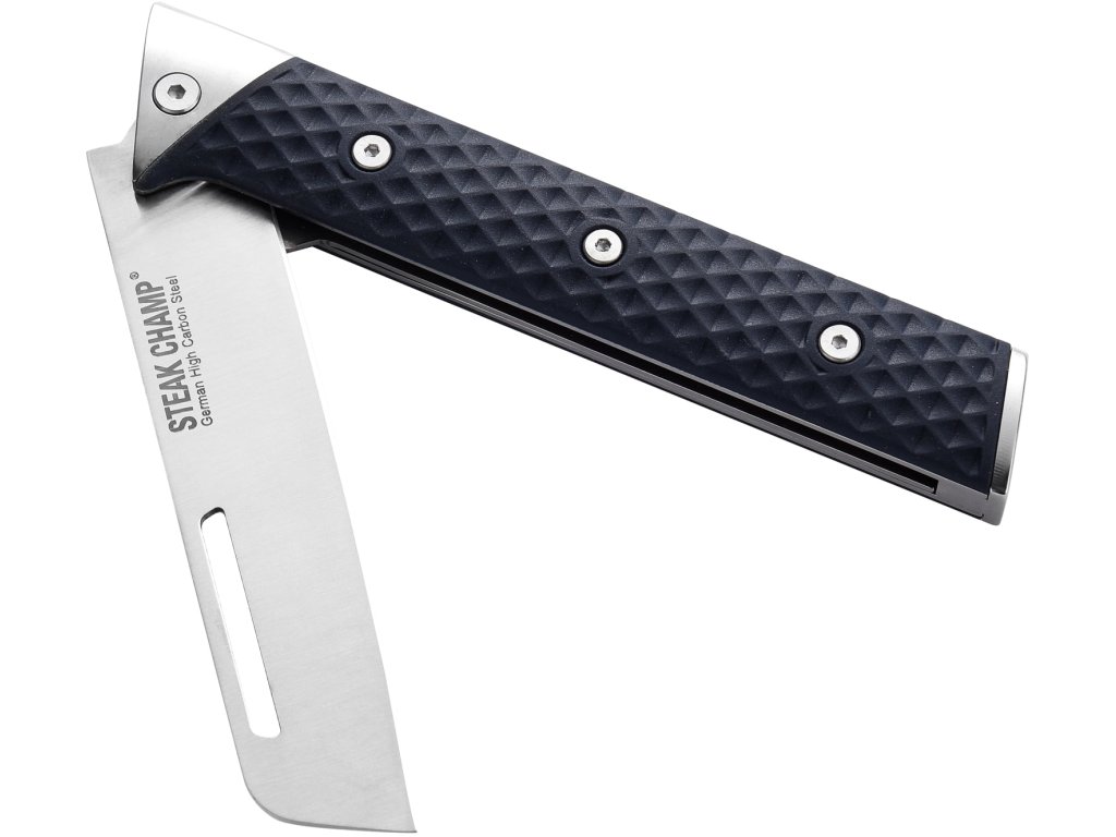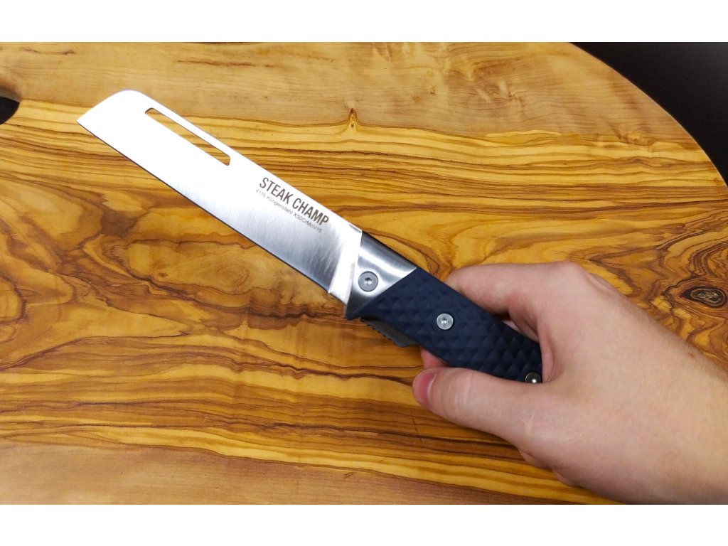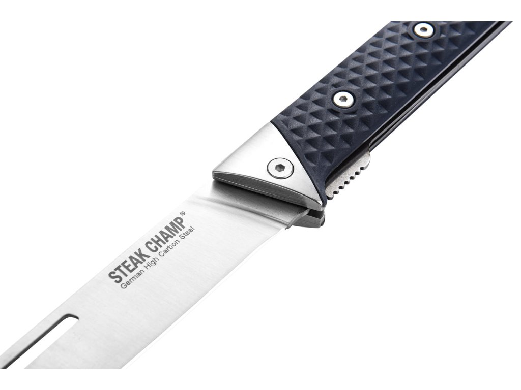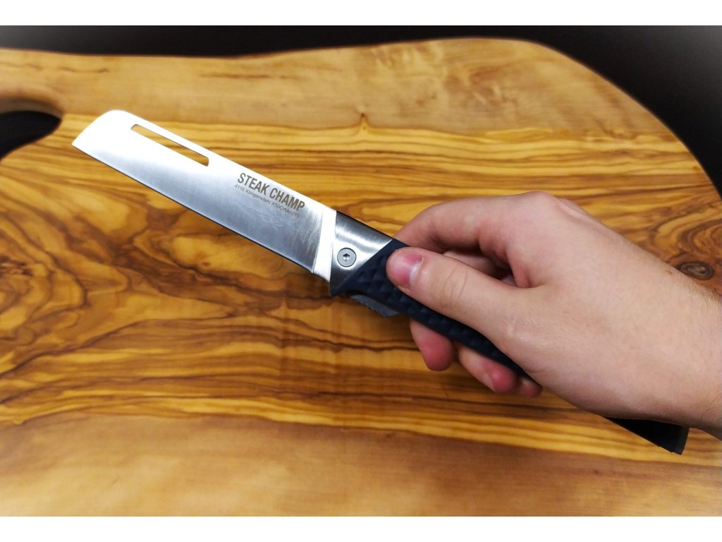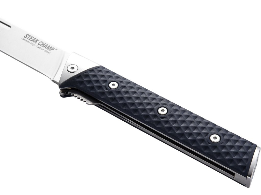 Skládací outdoorový nůž SteakChamp vyniká skvělými řeznými vlastnostmi, které vydrží velmi dlouho díky oceli s vysokým podílem uhlíku.