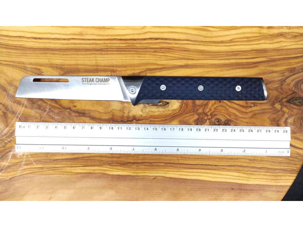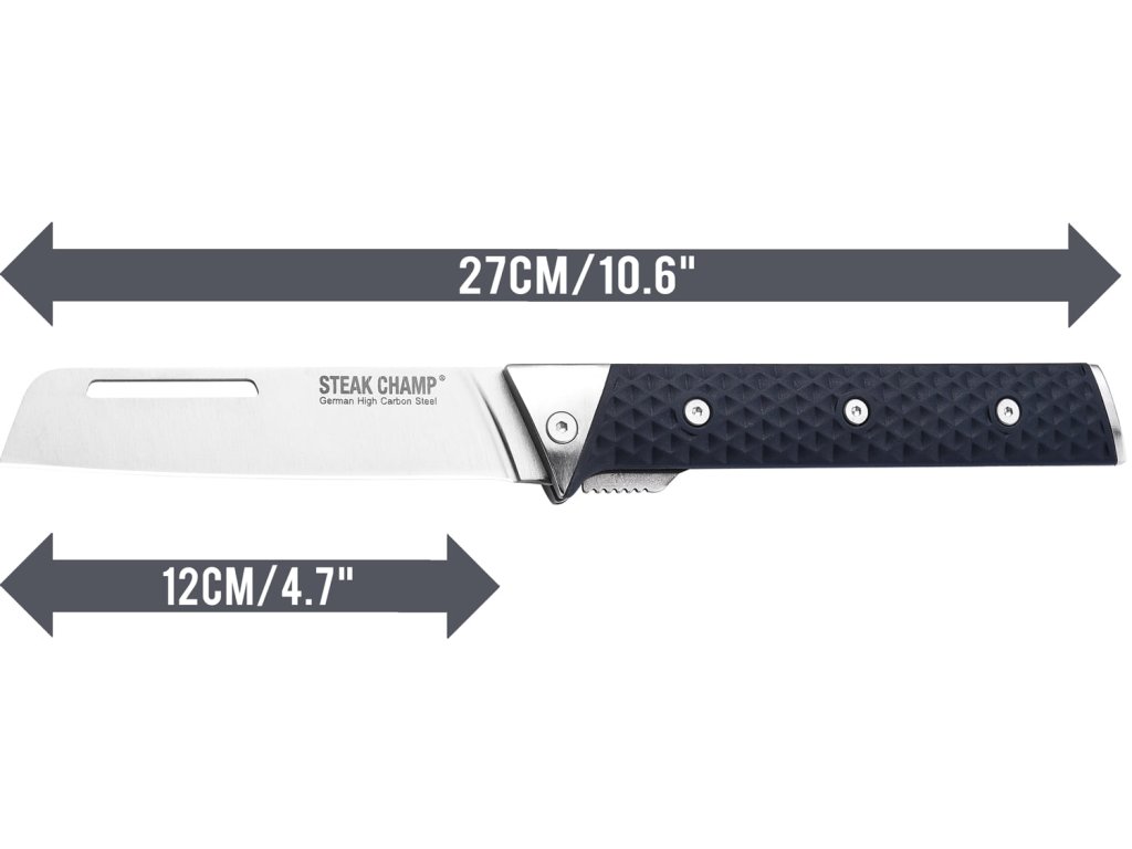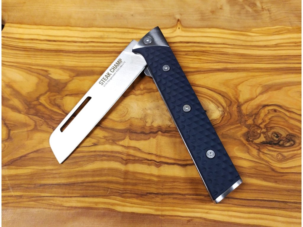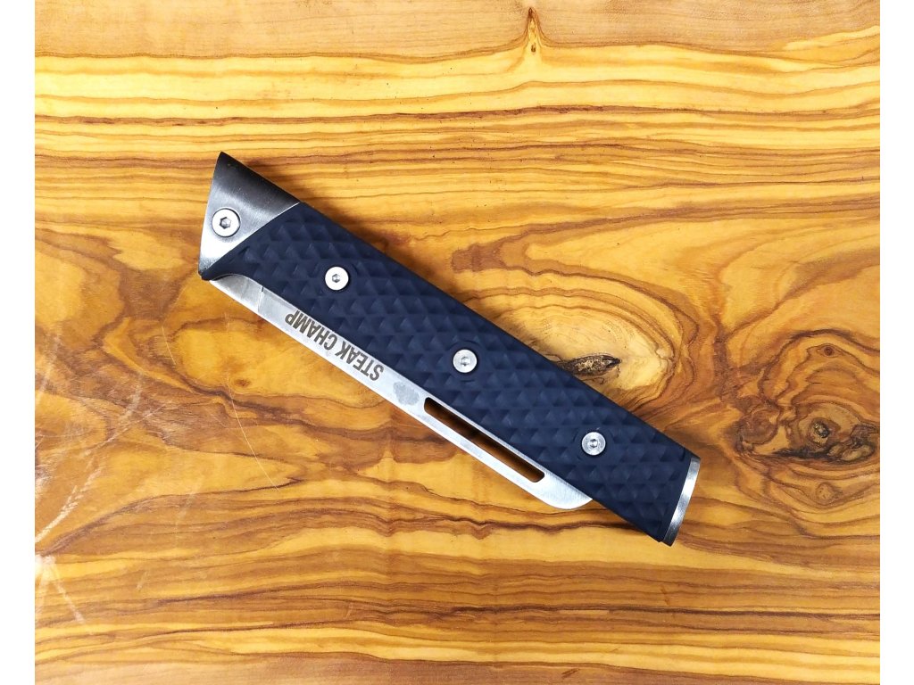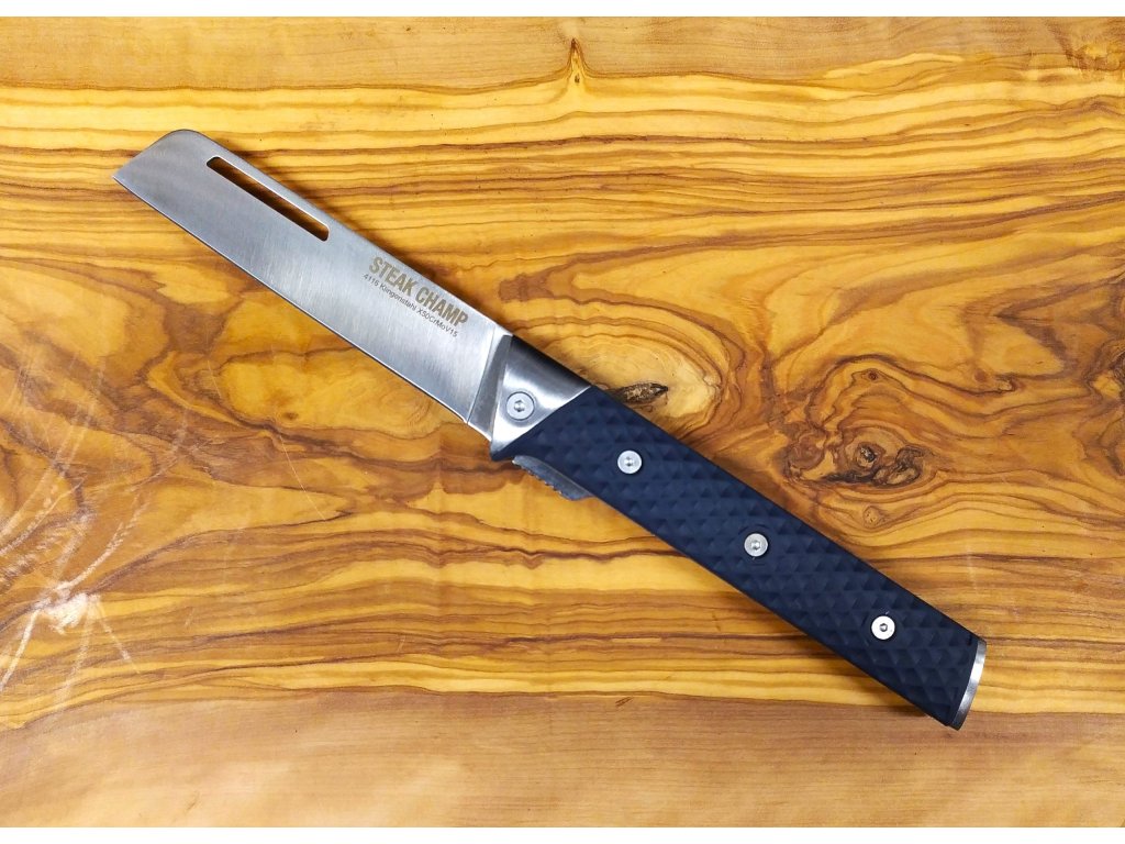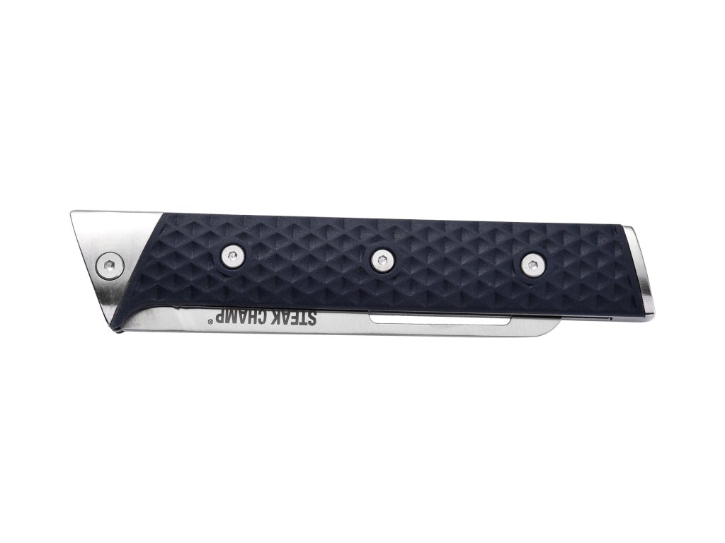 Skládací outdoorový nůž SteakChamp vyniká skvělými řeznými vlastnostmi, které vydrží velmi dlouho díky oceli s vysokým podílem uhlíku.