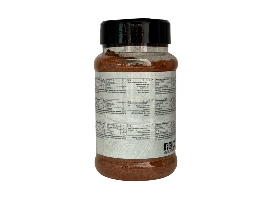 | Složení: | koření a bylinky (paprika uzená, kajenský pepř, paprika, česnek 3%, koriandr, skořice, zázvor), sůl, cukr, hnědý cukr, kvasnicový extrakt, mletá káva |