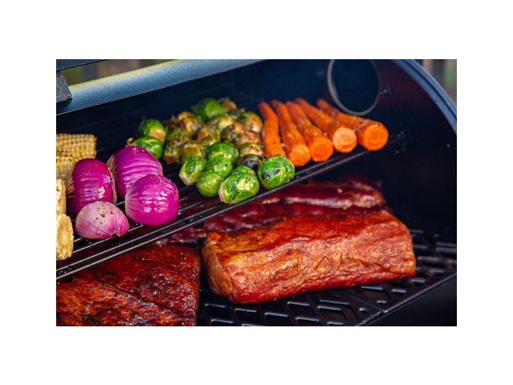 Krycí víko s regulátorem slouží pro regulaci žáru přímého i nepřímého grilování a má funkci odvodu tuků do sběrného kyblíku. Pelety jsou automaticky posouvány šnekovým podavačem do grilovací komory.
