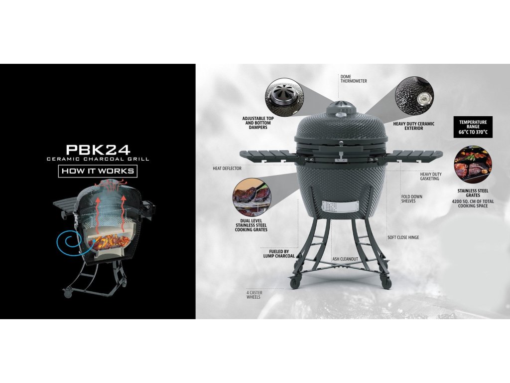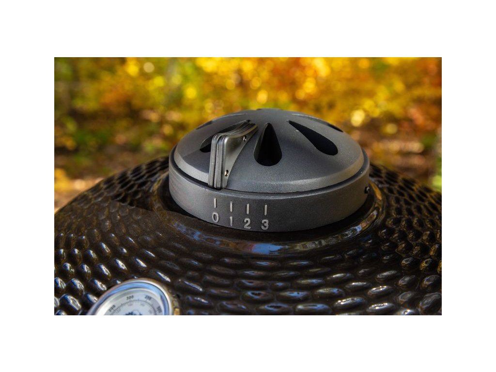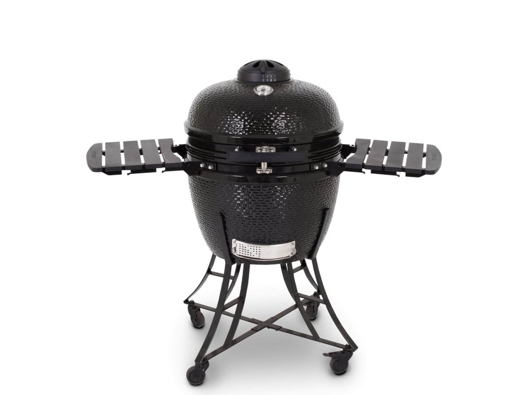 Keramický gril na dřevěné uhlí v černé barvě pro grilování, uzení, ale i přípravu pizzy či pečení chleba. Díky vynikajícím tepelně-retenčním vlastnostem udržuje stabilní teplotu pomocí přesné regulace proudění vzduchu.