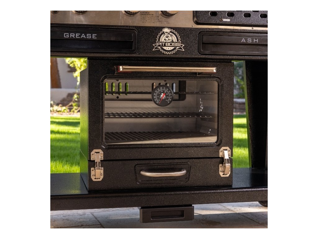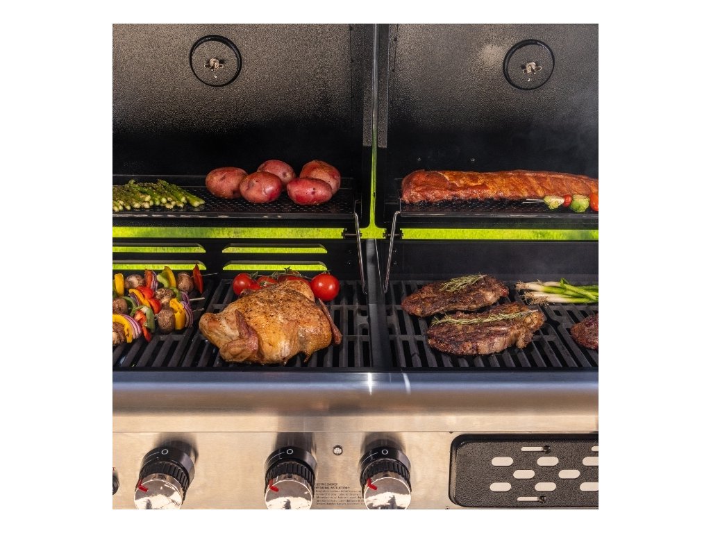 Grilování na plynu- Multifunkční design kombinuje plynový gril a gril na dřevěné uhlí s přidanou elektrickou udírnou s prosklenými dvířky.