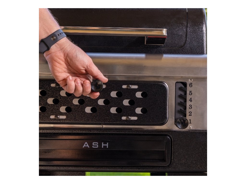 - Výšku palivového roštu vůči grilovacímu roštu upravíte pomocí páčky s šesti nastavitelnými pozicemi.