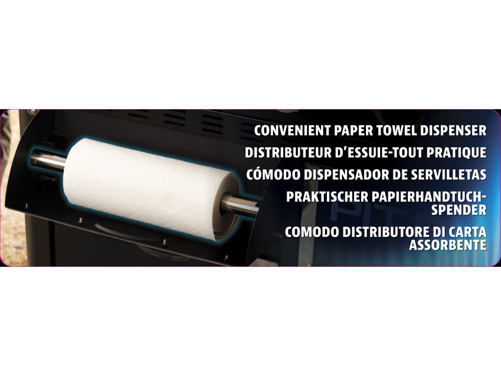 Při večerním grilování si oblíbíte osvětlené rámečky ovládacího panelu. Dalším praktickým doplňkem jsou skládací boční police s háčky, držák na papírové utěrky, držák na odpadkový pytel a integrovaný otvírák na lahve.