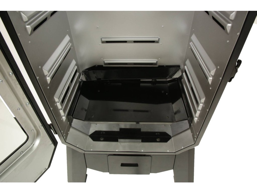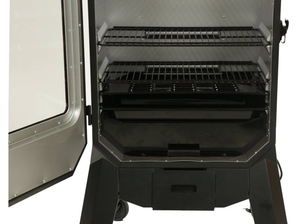 Sledovat masové sondy a ovládat teplotu můžete tak z pohodlí gauče nebo terasy. Prosklená dvířka eliminují potřebu otevírání a kontrolování uzení. Udírna nabízí spoustu prostoru pro vaše uzení díky vícepolohovému regálovému systému.