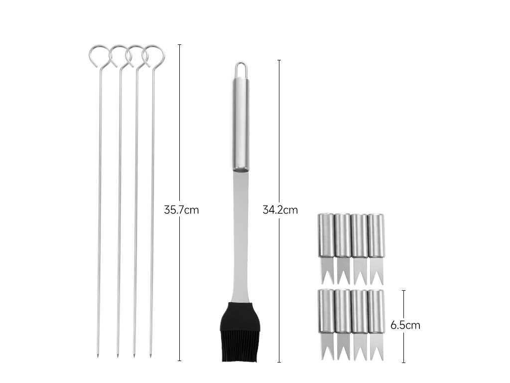 Sada zahrnuje špachtli, vidlici, kleště, nůž a mašlovačku, které vám pomohou otočit, přenášet a nakrájet jídlo na grilu. Grilovací a kukuřičné špízy jsou ideální pro přípravu různých druhů pokrmů.