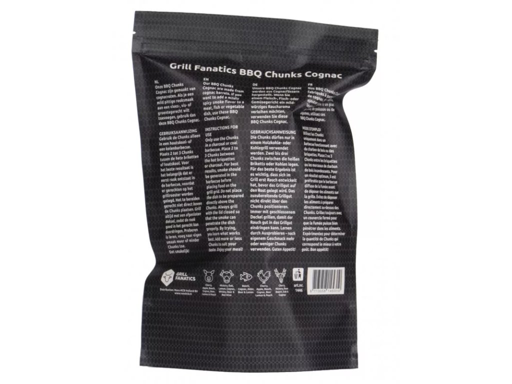 Tyto koňak BBQ kousky jsou vyrobeny ze sudů po koňaku. Dodávají kořeněnou uzenou chuť masitým, rybím nebo zeleninovým pokrmům.