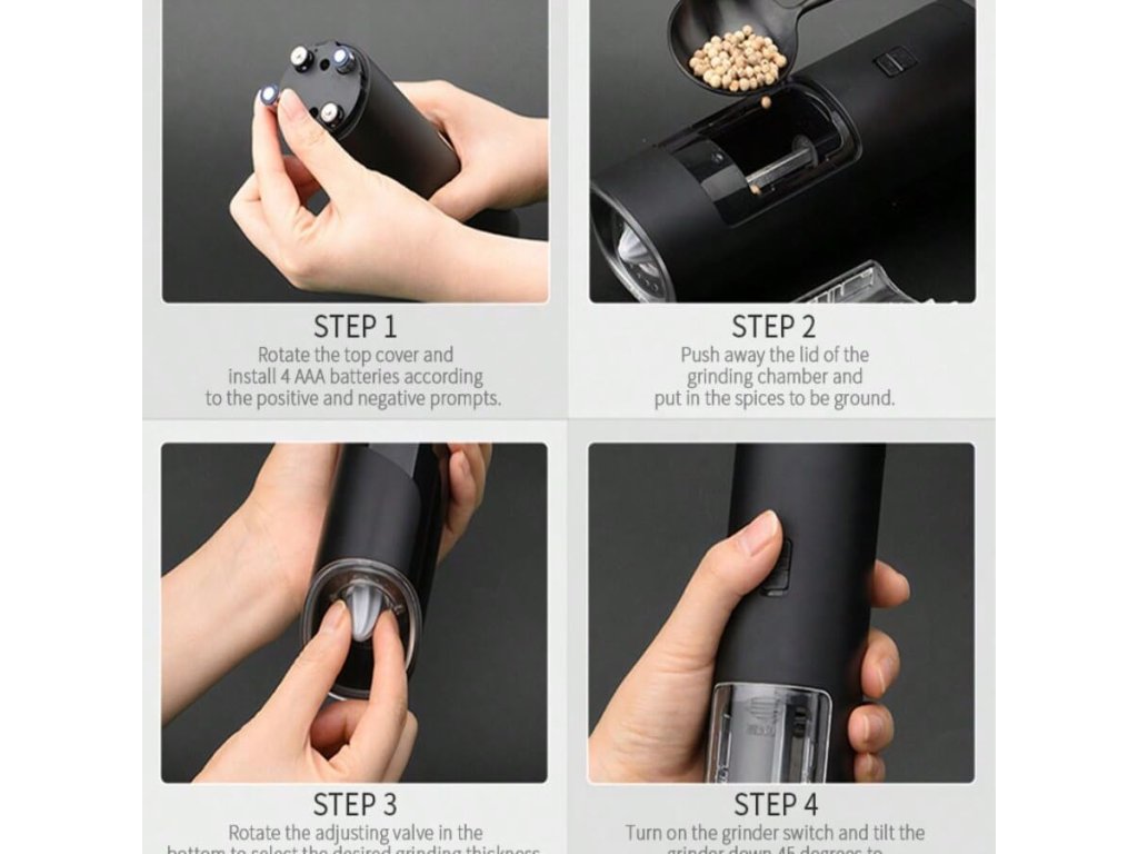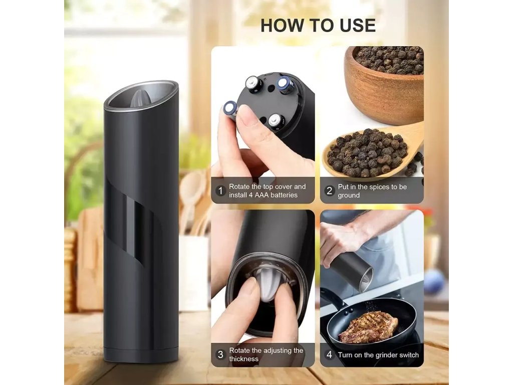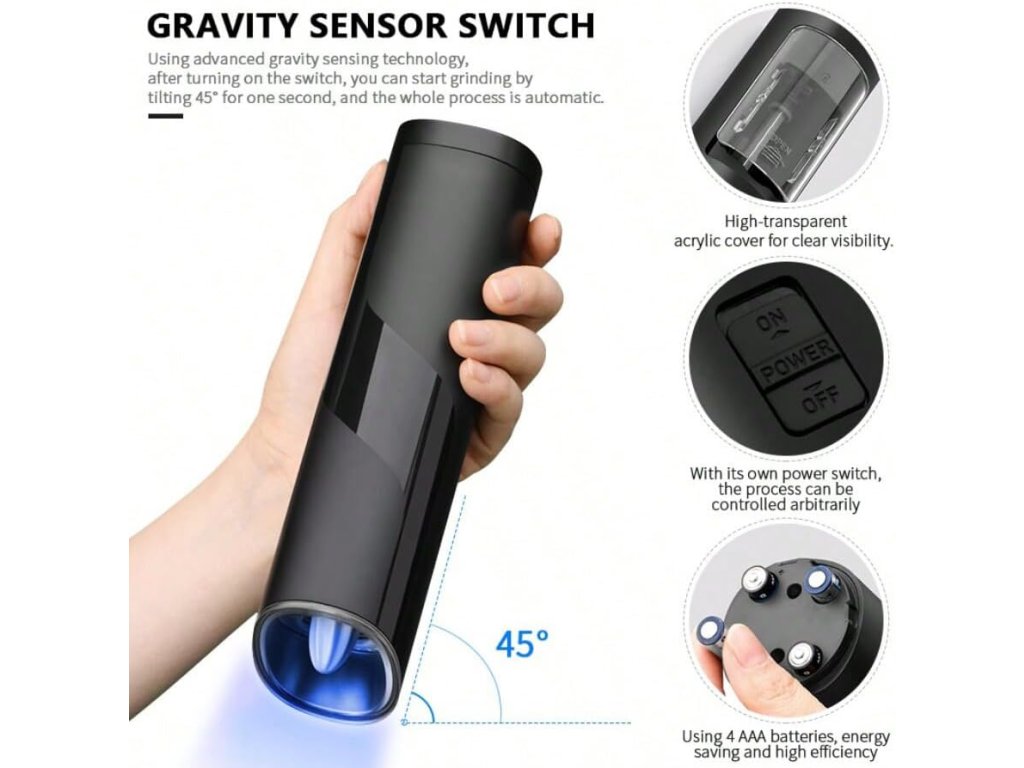 Mlýnek je napájen 4 bateriemi typu AAA (nejsou součástí dodávky), které zajišťují silné a konzistentní mletí.