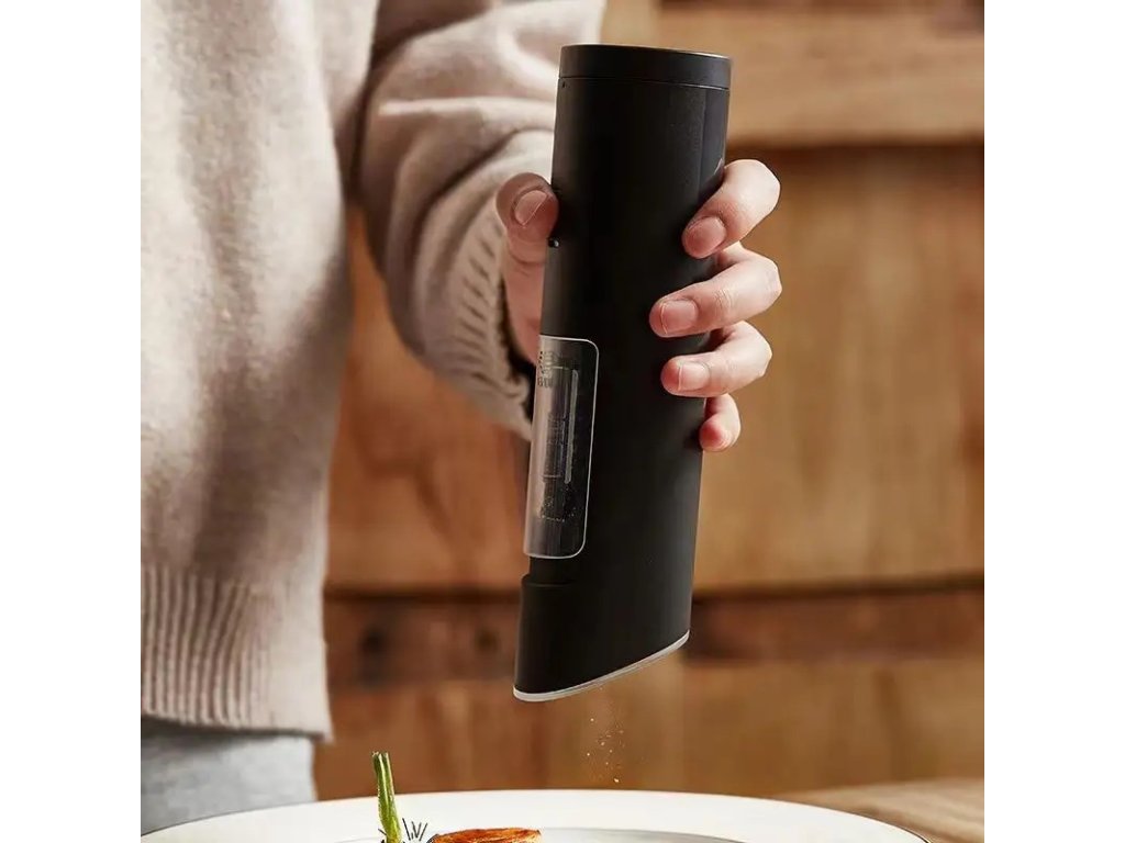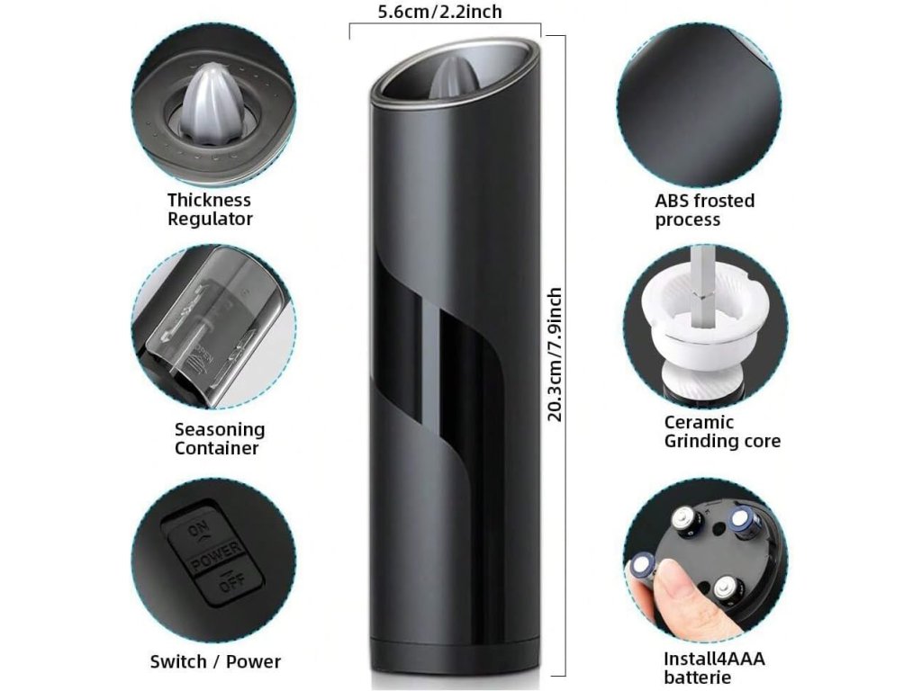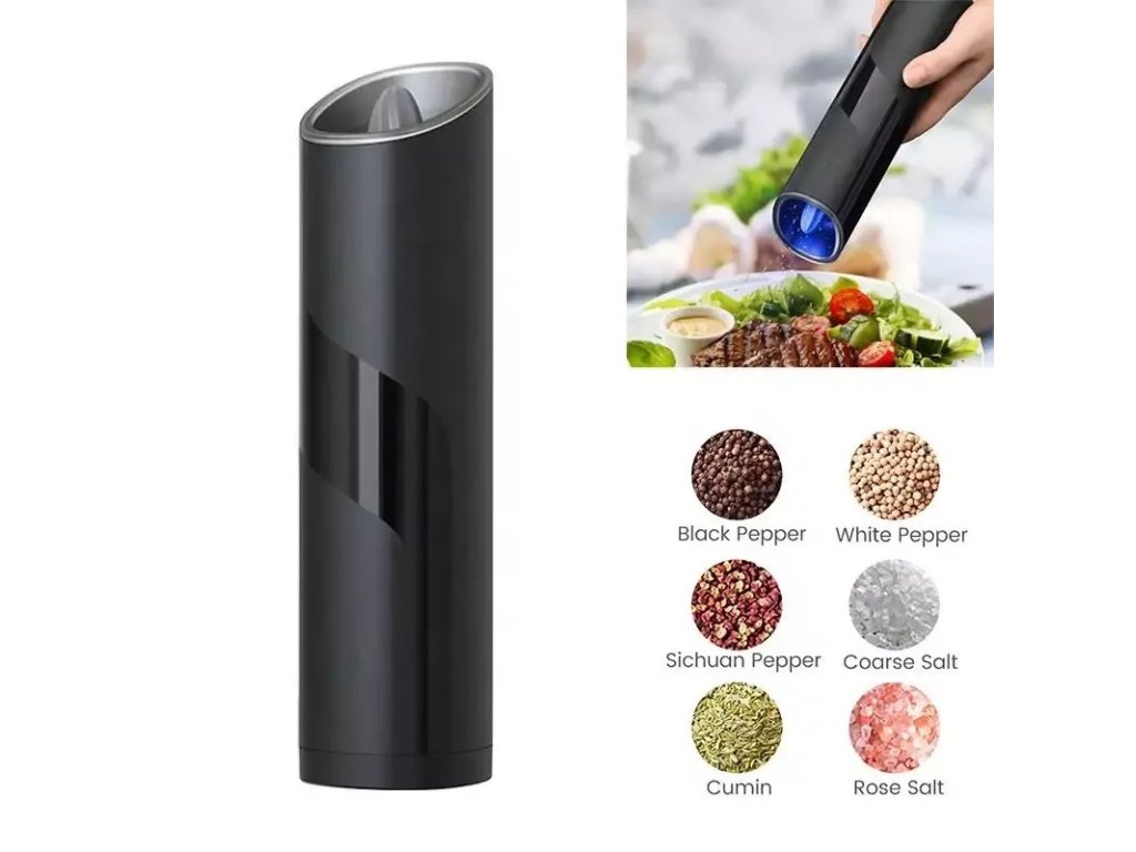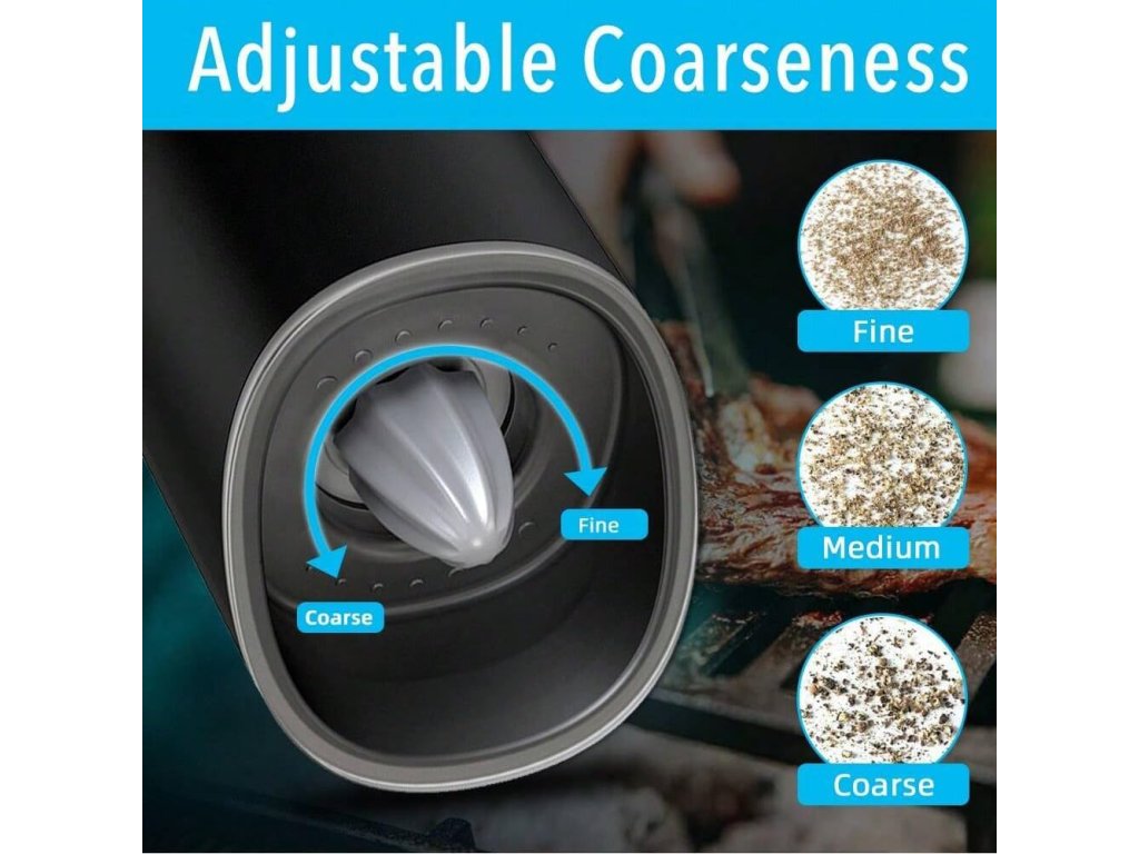 Elektrický mlýnek na koření s nastavitelným mletím hrubosti je vyroben z vysoce kvalitního materiálu ABS a nerezové oceli, což zaručuje jeho dlouhou životnost a elegantní vzhled.