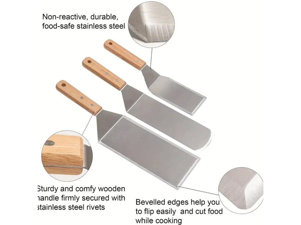 Tyto grilovací špachtle jsou navrženy s ohledem na spolehlivost a pohodlí při používání. Nerezová ocel poskytuje odolnost vůči korozi a snadnou čistitelnost, zatímco dřevěná rukojeť zajišťuje pohodlný úchop a estetický vzhled. S těmito špachtlemi můžete snadno otočit a přenášet grilované pokrmy s přesností a bezpečností. Ideální volba pro každého milovníka grilování!