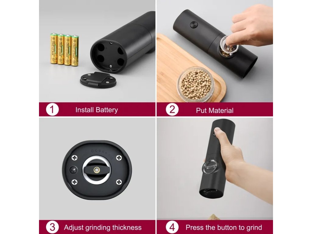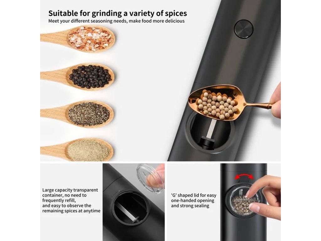 - LED podsvícení: Funkční osvětlení mletého koření umožňuje přesné dávkování i při horších světelných podmínkách.