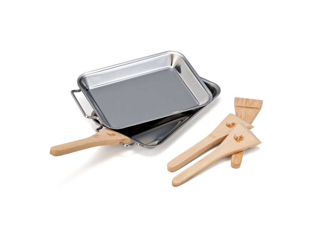 Sada grilovací pánev Flash obsahuje dvě nerezové pánve a čtyři bambusové škrabky. Škrabky lze použít i jako rukojeť.