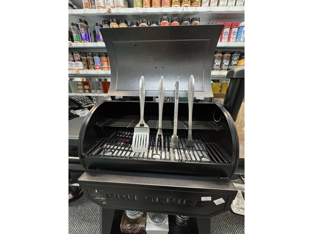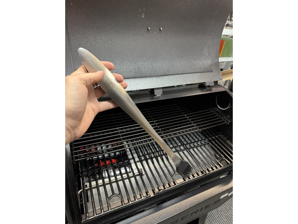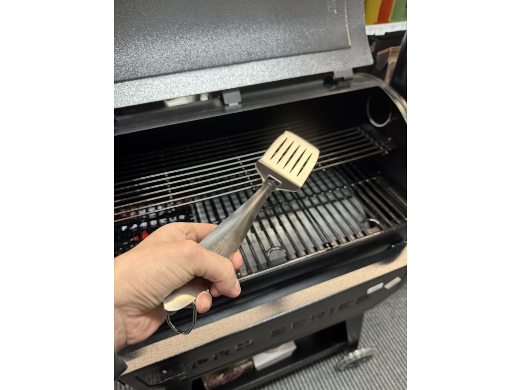 - Grilovací obracečka – Pevná a široká, ideální pro snadné obracení steaků a burgerů. Obsahuje praktický otvírák lahví a zubatou hranu pro porcování masa.