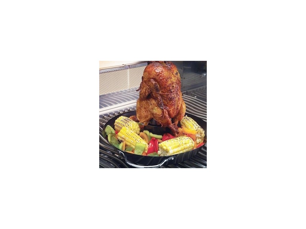 - Udržuje kuře během vaření ve vzpřímené poloze, což umožňuje rovnoměrné zhnědnutí a křupavost po celém povrchu.