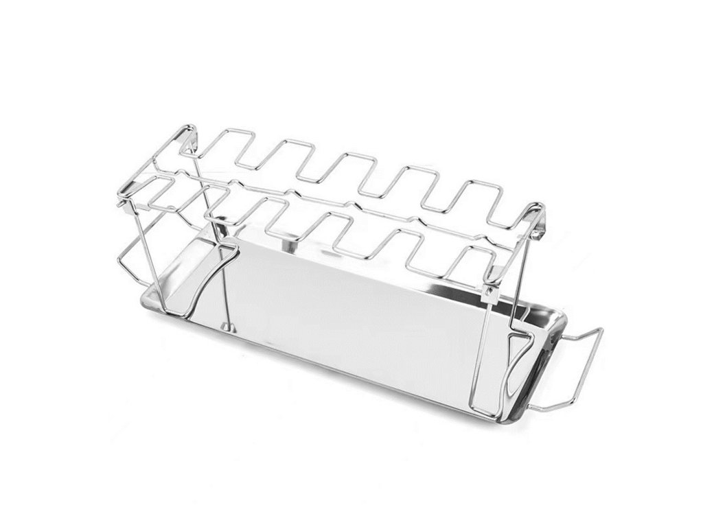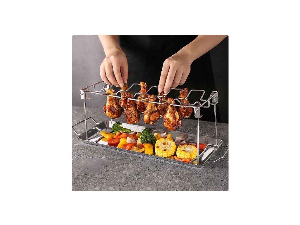 Stojan na pečení kuřecích křídel a stehenTato sada je ideálním pomocníkem pro každého milovníka grilování, který si chce vychutnat dokonale propečená kuřecí křídla nebo stehna. Díky zavěšení masa na stojan dochází k rovnoměrnému proudění vzduchu, což zajišťuje křupavou kůrku ze všech stran.