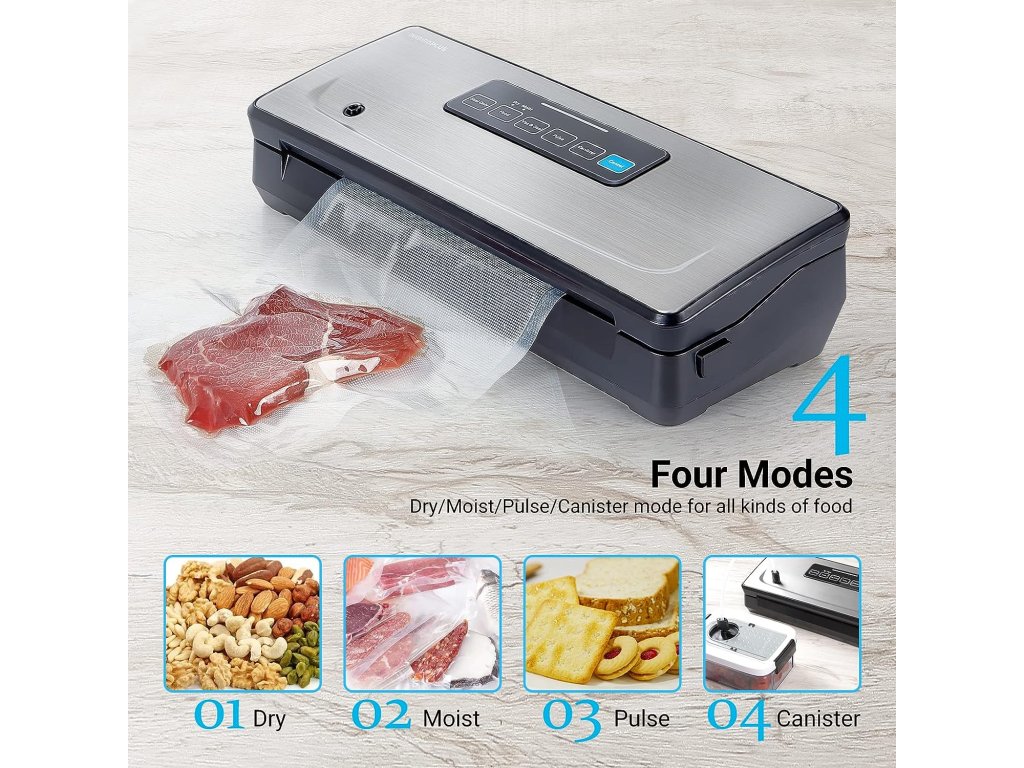 Efektivní vakuová pumpa s tlakem -85kpa a výkonný motor s hliníkovým chladičem zajišťují rychlé a stabilní vakuování potravin během pouhých 20 sekund. INK-VS02 nabízí čtyři různé režimy zavírání - suchý, vlhký, impulzní a speciální režim pro zavírání nádob, což z něj dělá univerzální vakuovou svářečku pro různé druhy potravin.