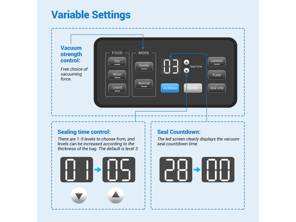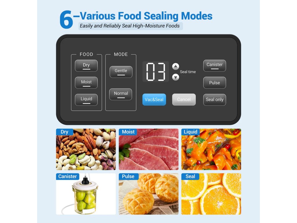 - 4 režimy vakuování – Vac & Seal/Pouze těsnění/Pulzní/Velikost