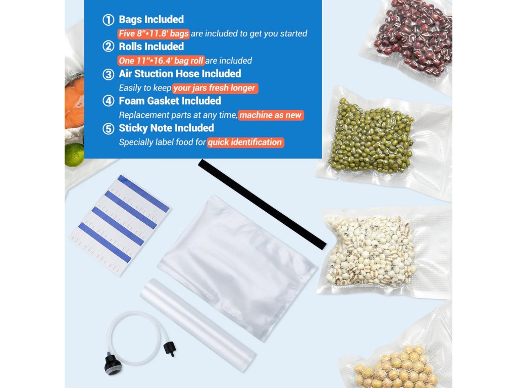 - Příslušenství: vakuové sáčky, hadice pro odsávání vzduchu, náhradní pěnové těsnění, popisky, návod.