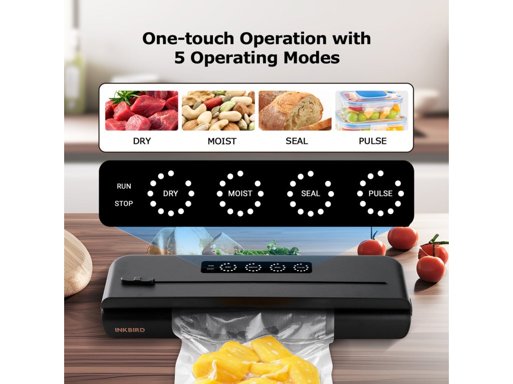 Jediným dotykem můžete uzamknout původní chuť potravin a uchovat je déle čerstvé než dříve. Tato vakuová svářečka IVS-011 podporuje pět provozních režimů: suché potraviny, vlhké potraviny, tekutiny, sváření, nádoba a External Vac. Dokončení programu v suchém režimu trvá pouze 17 sekund. Vyberte libovolnou funkci a zařízení vás při spuštění a zastavení vyzve pomocí indikátorů LED.
