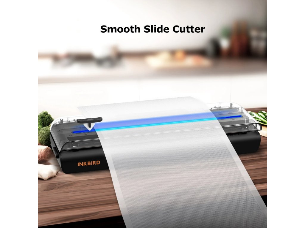 Víko je vybaveno integrovanou posuvnou řezačkou, která se hladce používá a pohodlně ovládá. Velikost sáčku lze okamžitě přizpůsobit přesně podle vašich potřeb.
