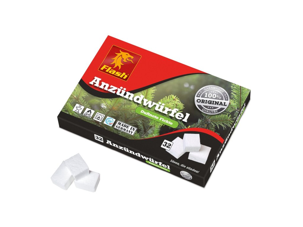 Palivové kostky určené pro snadné a bezpečné zapálení grilu, trouby nebo krbu. Tyto kostky jsou vyrobeny z parafínu a mají příjemnou vůni smrku, která zanechá příjemnou atmosféru během grilování nebo venkovního vaření. Jedna zapalovací deska obsahuje 32 kostek, což umožňuje snadné dávkování a praktické použití.
