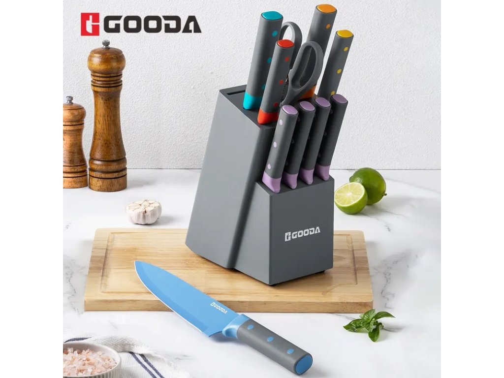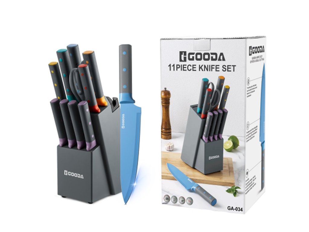 Kompletní 11-dílná sada kuchyňských nožů značky Gooda je ideálním pomocníkem pro každodenní vaření. Sada obsahuje širokou škálu nožů pro různé účely, které jsou přehledně uloženy v moderním stojanu.
