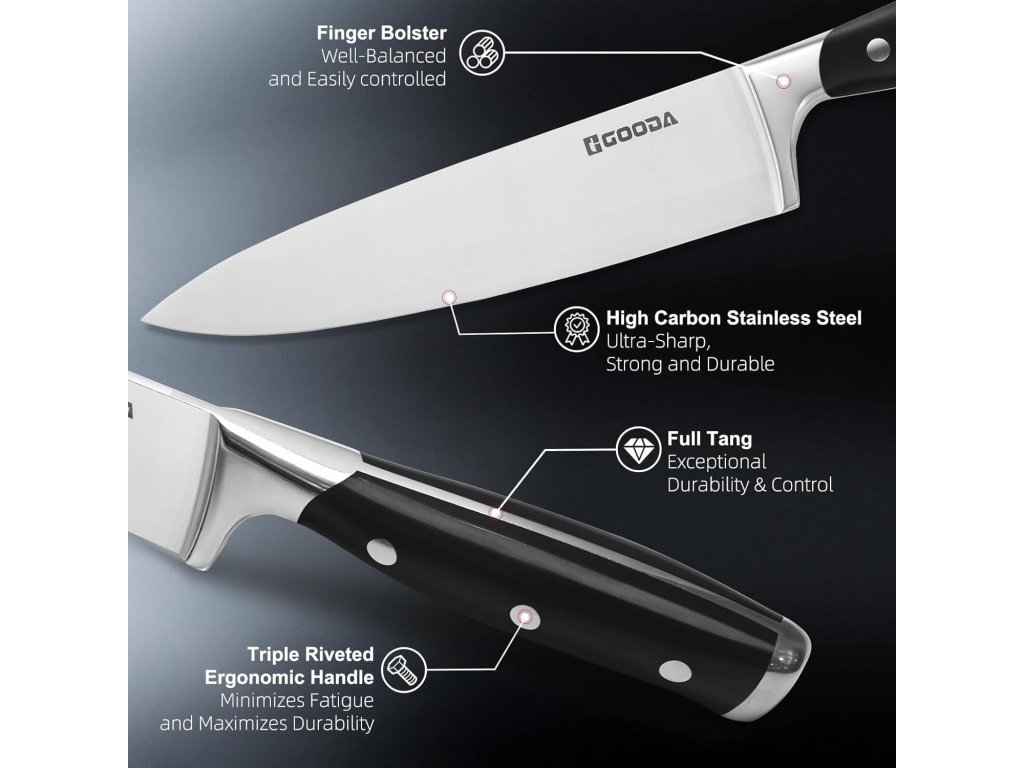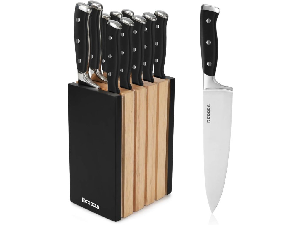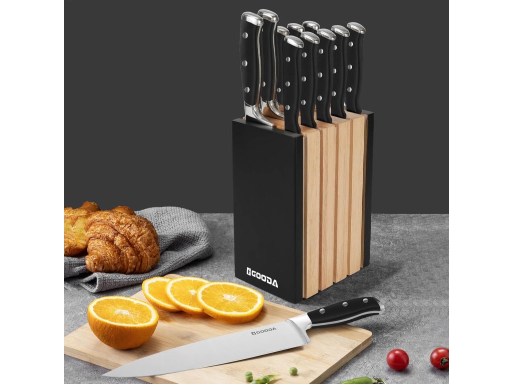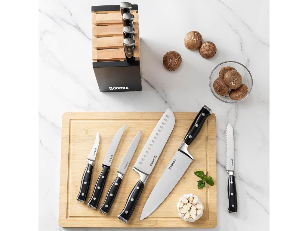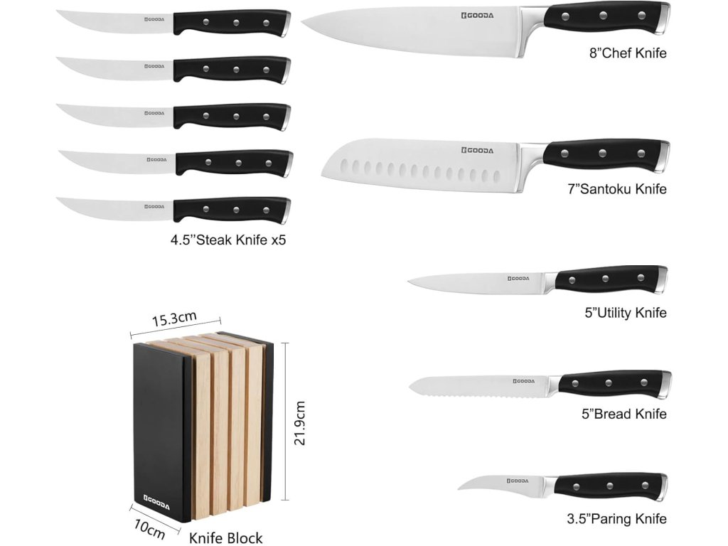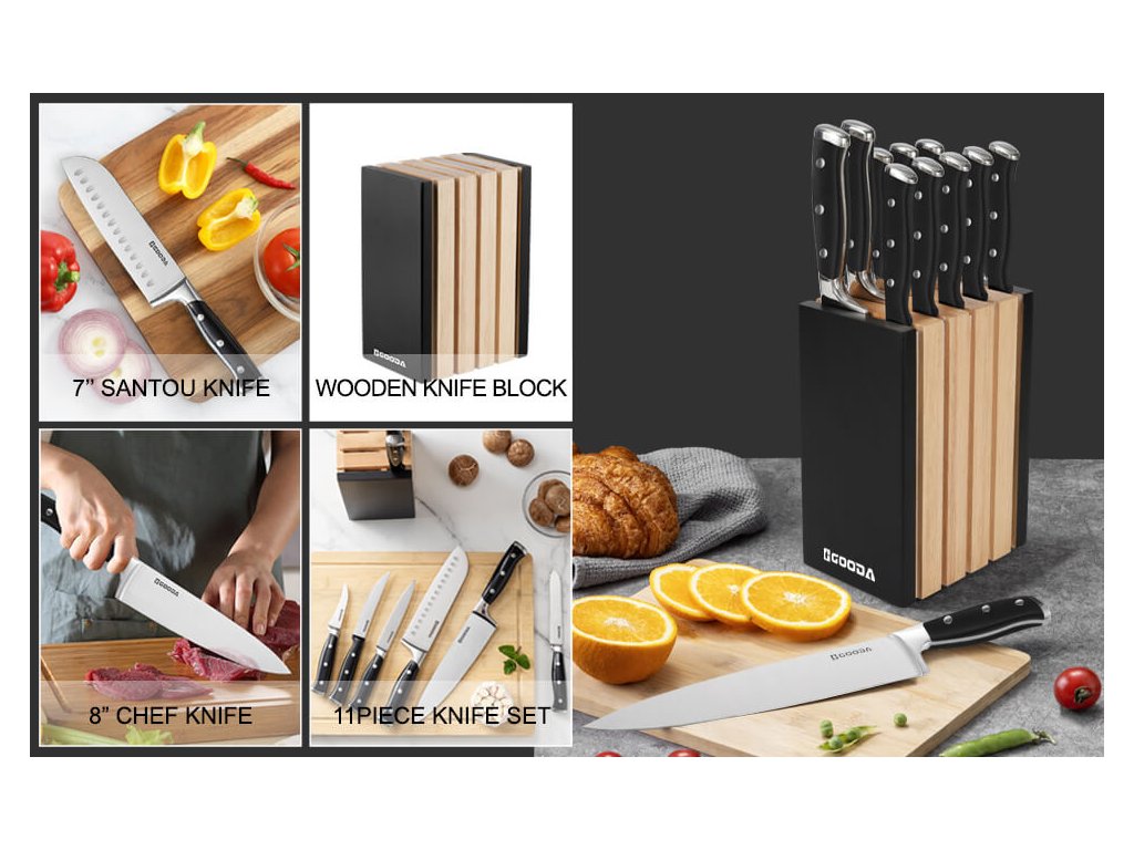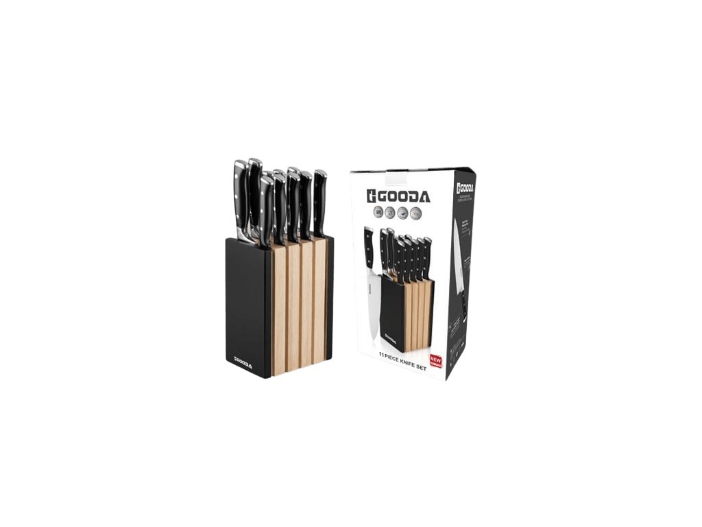 Tato 11dílná sada kuchyňských nožů značky Gooda představuje ideální řešení pro každou moderní kuchyni. Sada obsahuje širokou škálu nožů pro různé typy krájení, od precizního porcování masa až po krájení pečiva a steaků.