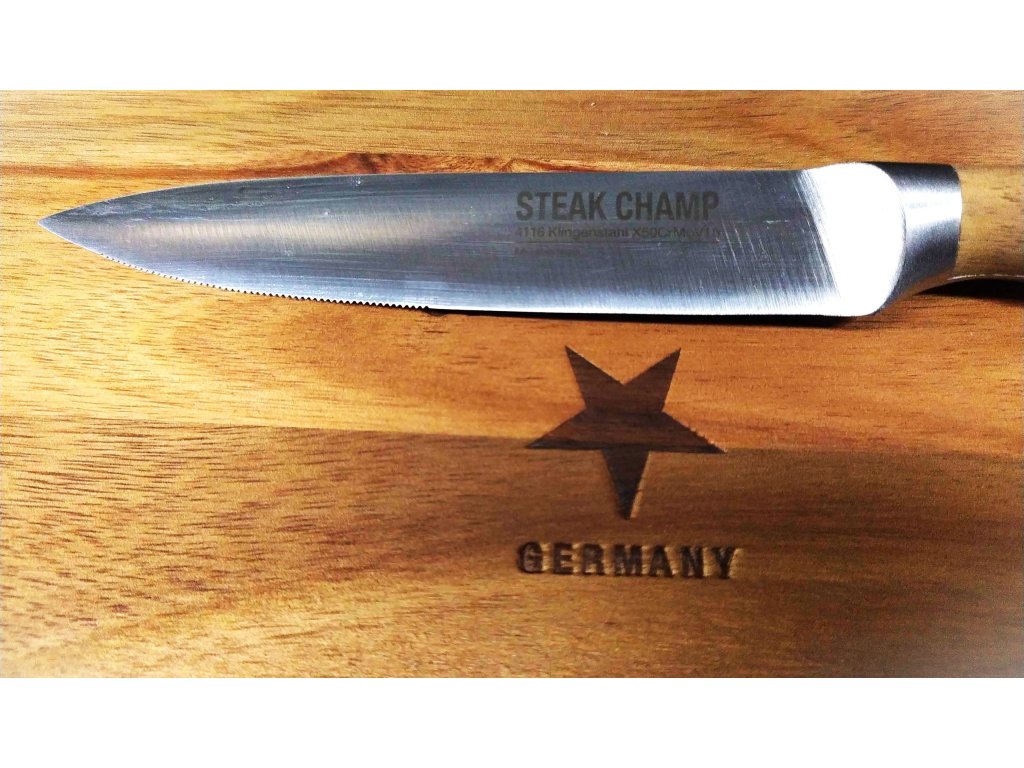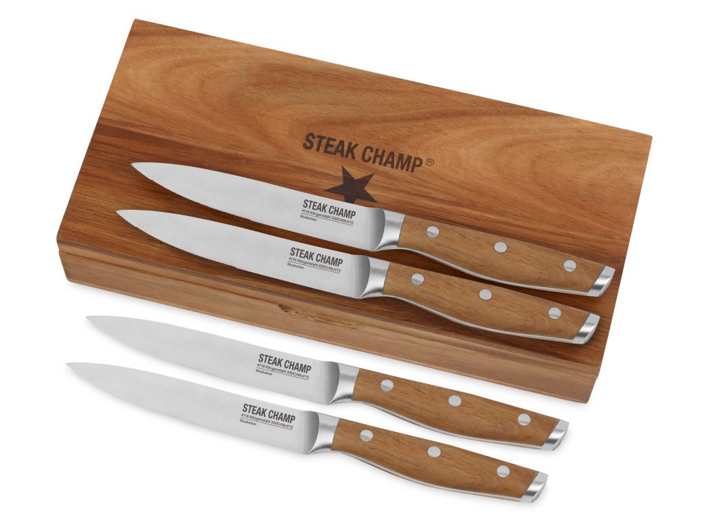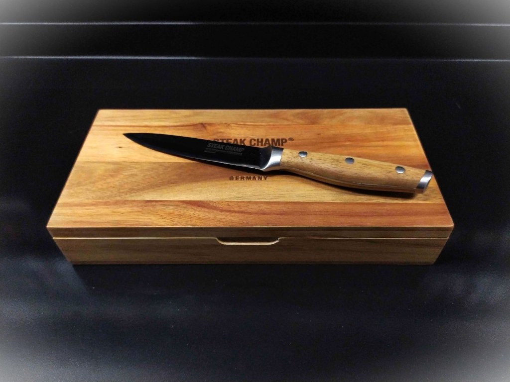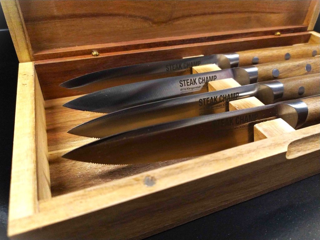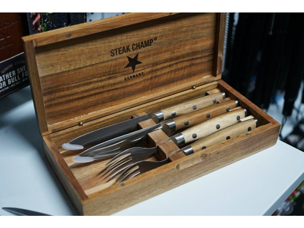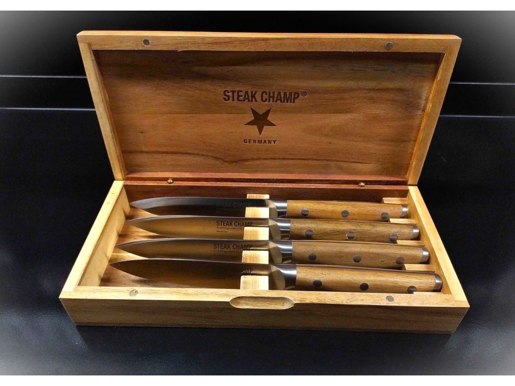 Dárková sada 4 nožů na steak od SteakChamp nemůže chybět ve výbavě žádného milovníka masa. Krájejte každé sousto s lehkostí díky ostrým nožům, které jsou speciálně určené a vyrobené pro perfektní řez steaku.
