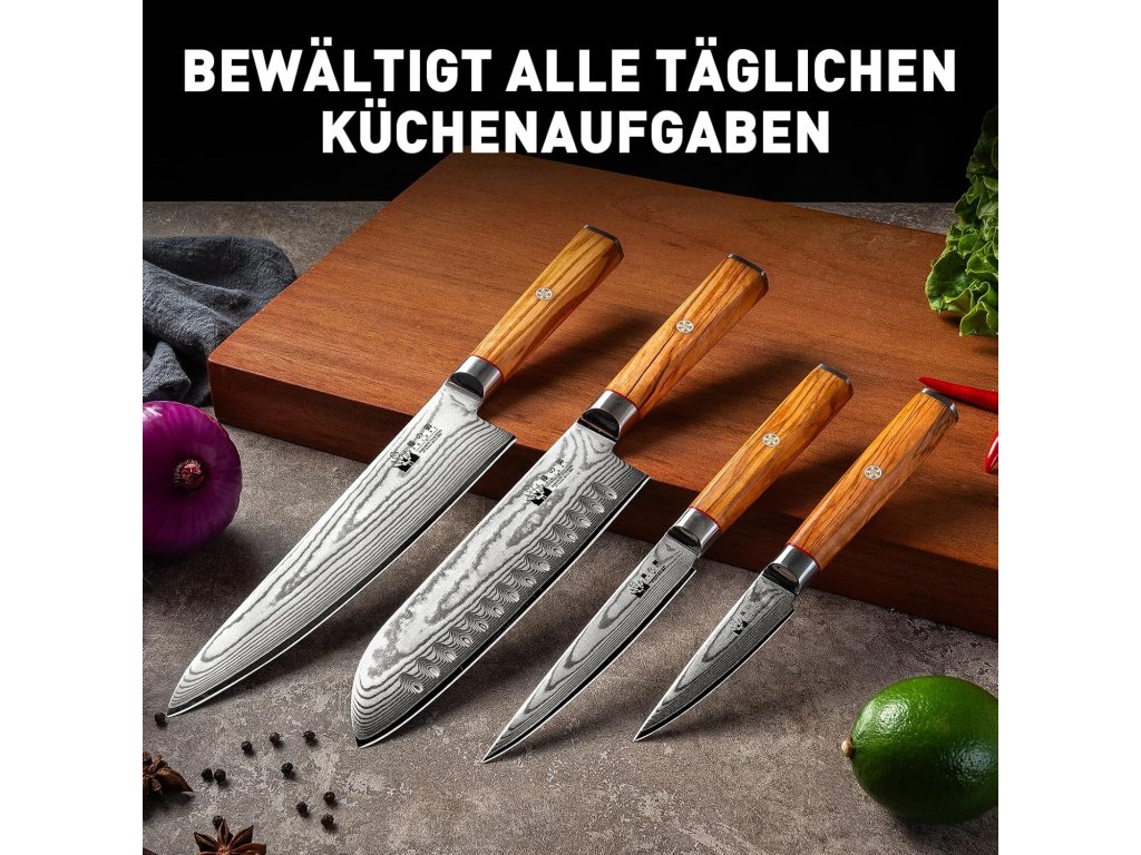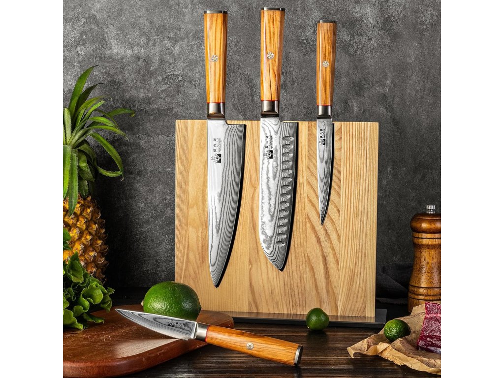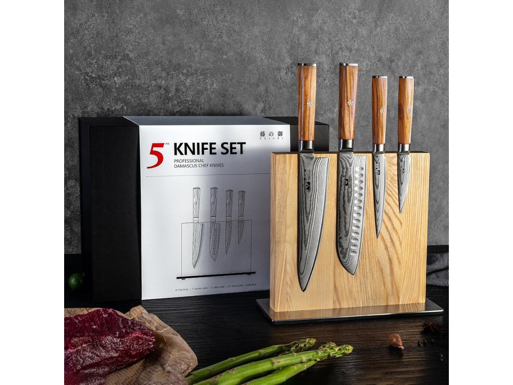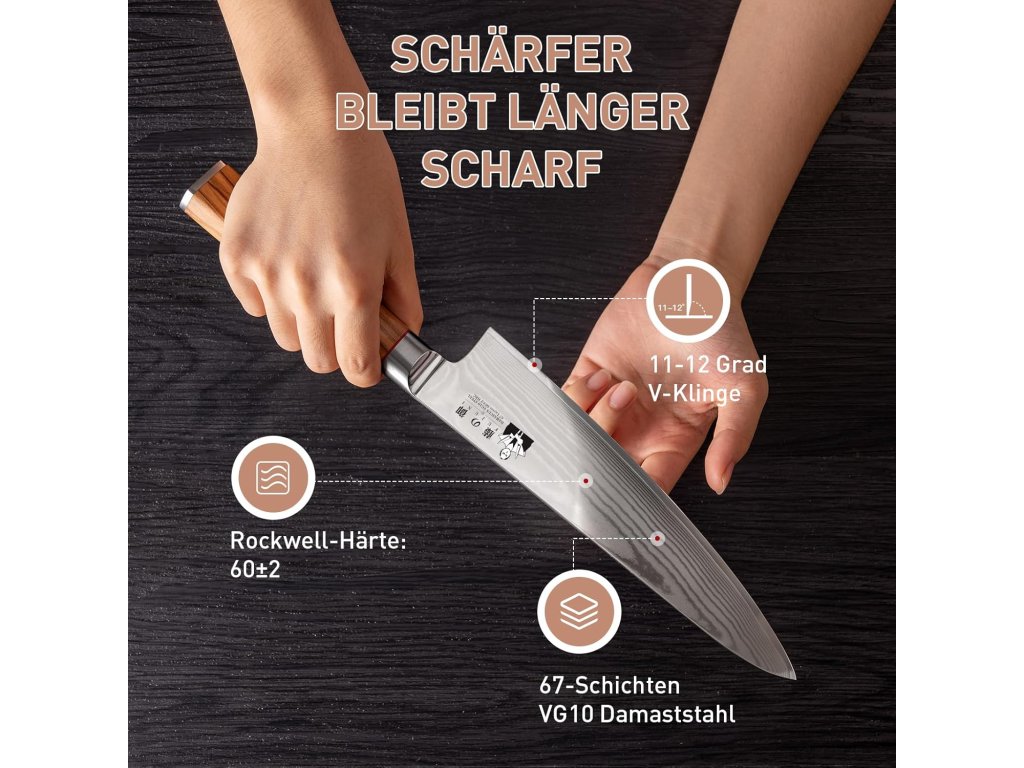 Sada damaškových nožů s blokem je vyrobena z 67vrstvé damaškové oceli VG-10 a vyznačuje se vysokou odolností proti korozi, odolností proti opotřebení a dlouhou životností. Každá čepel je podrobena ultra-přesnému vakuovému tepelnému zpracování s tvrdostí podle Rockwella 60±2 HRC.