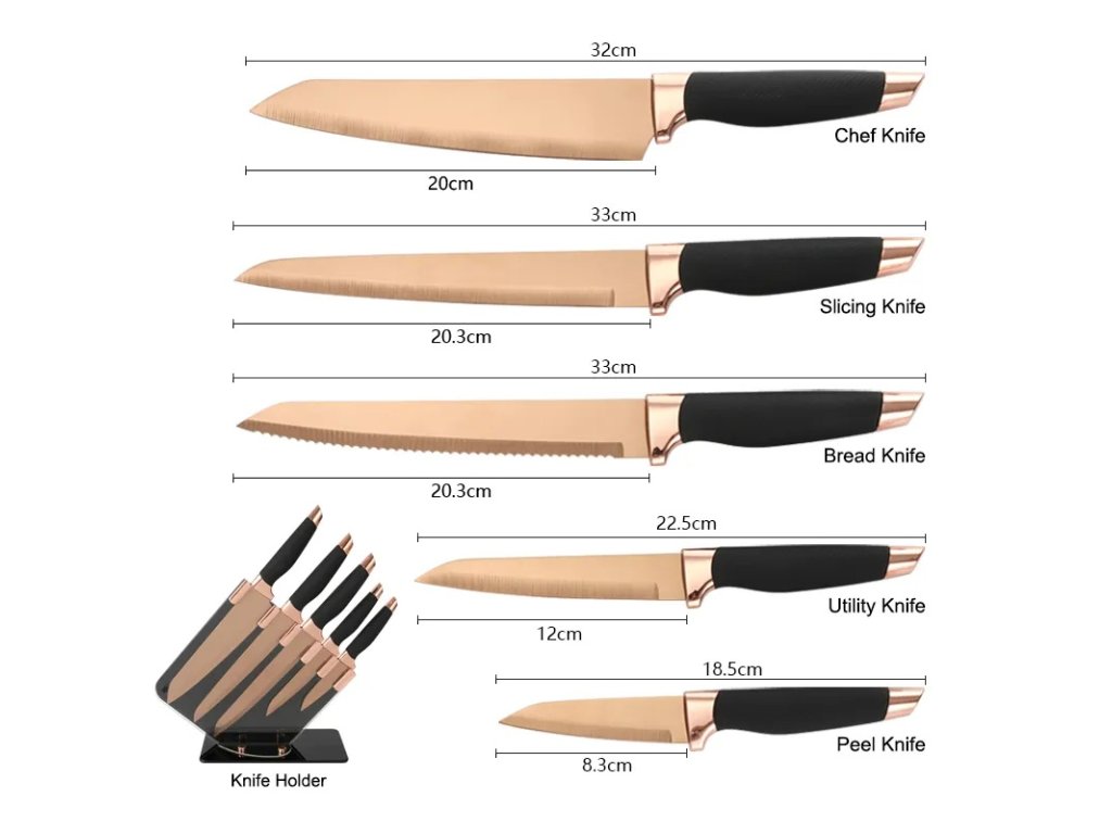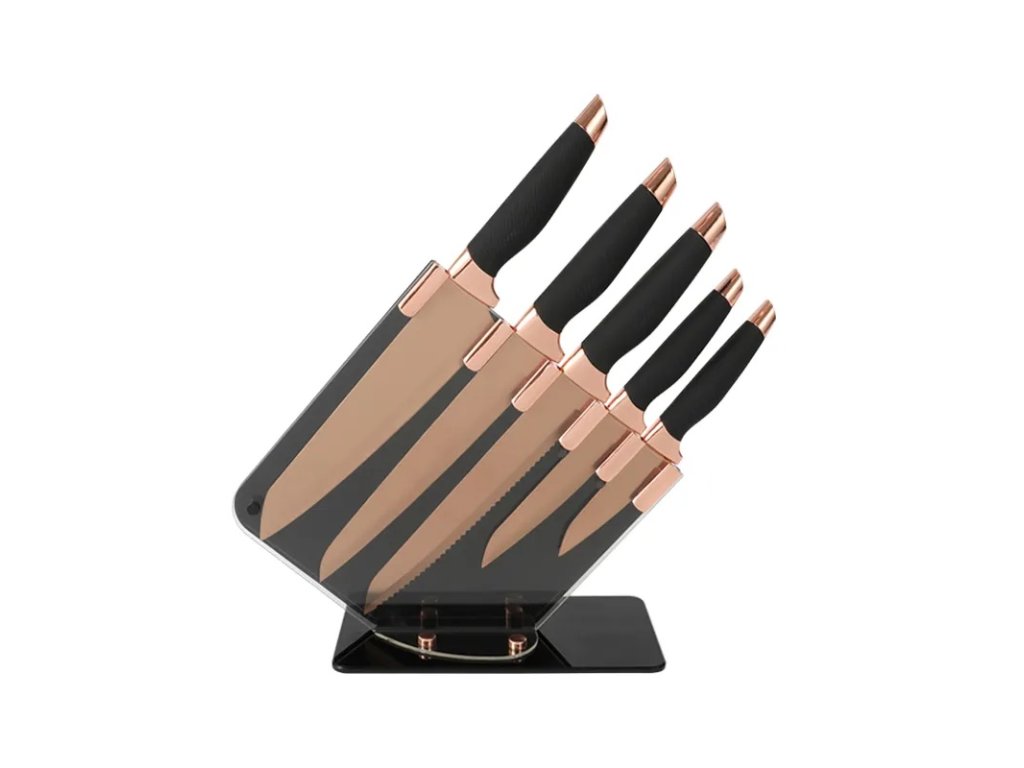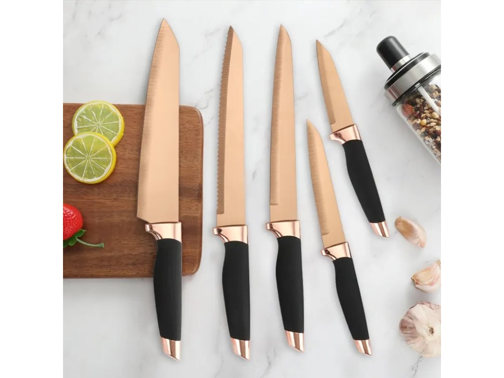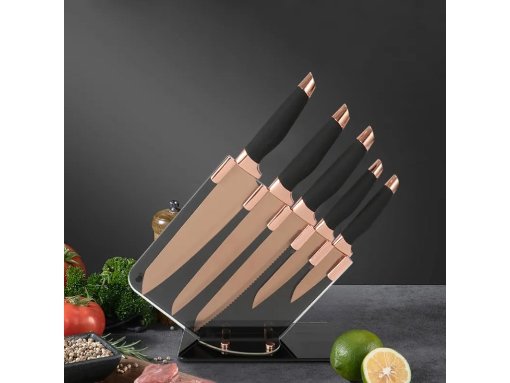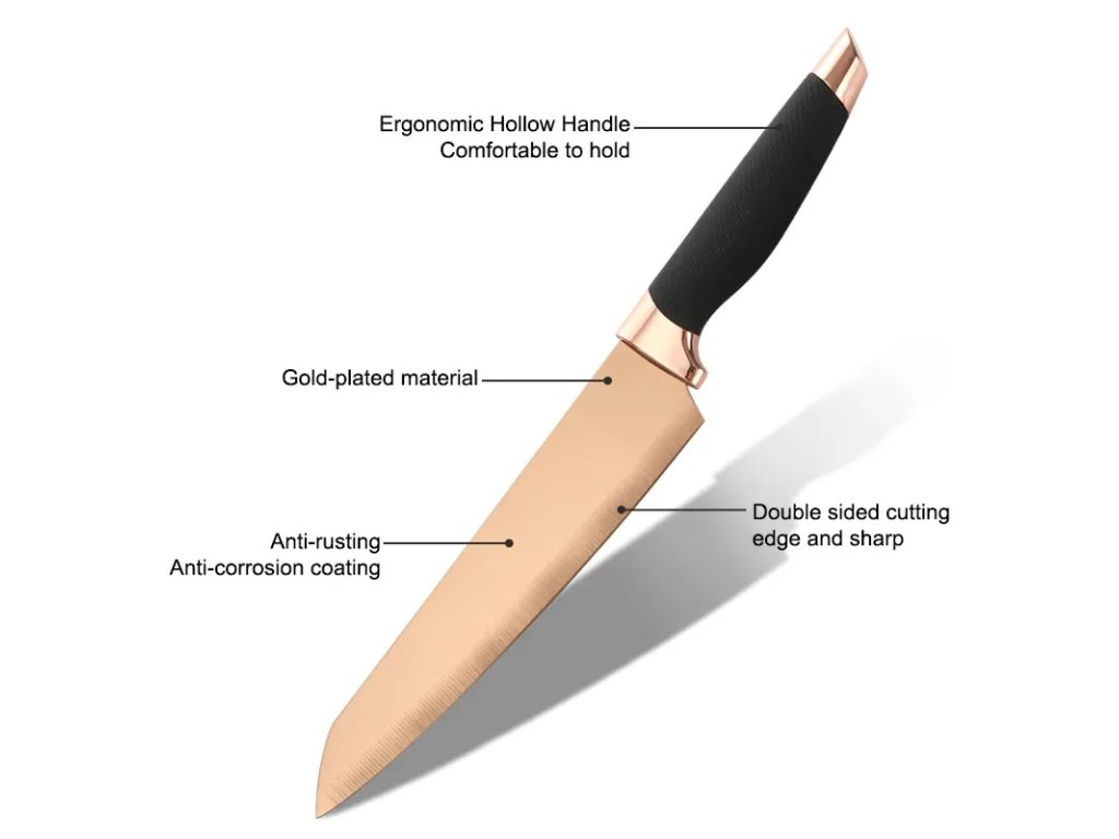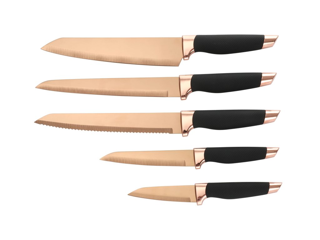 Tato designová sada nožů kombinuje funkčnost s moderním vzhledem edice Rose Gold. Čepele jsou vyrobeny z kvalitní nerezové oceli s nepřilnavým povrchem v barvě růžového zlata, což usnadňuje krájení a následnou údržbu.