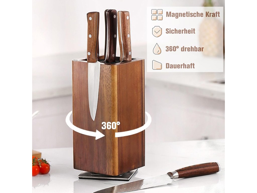 Magnetický blok na nože se otáčí o 360°, což je nejen prostorově úsporné, ale také snadno dostupné. Základna je vyrobena z vysoce kvalitní nerezové oceli, která je stabilní a designově zajímavá.
