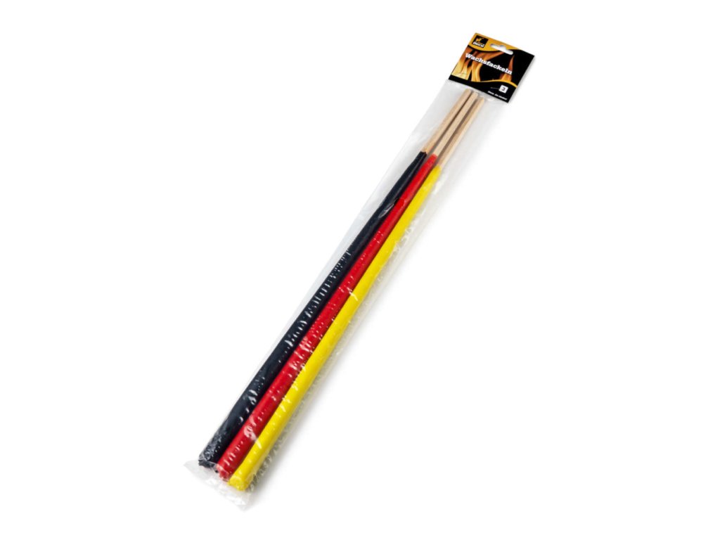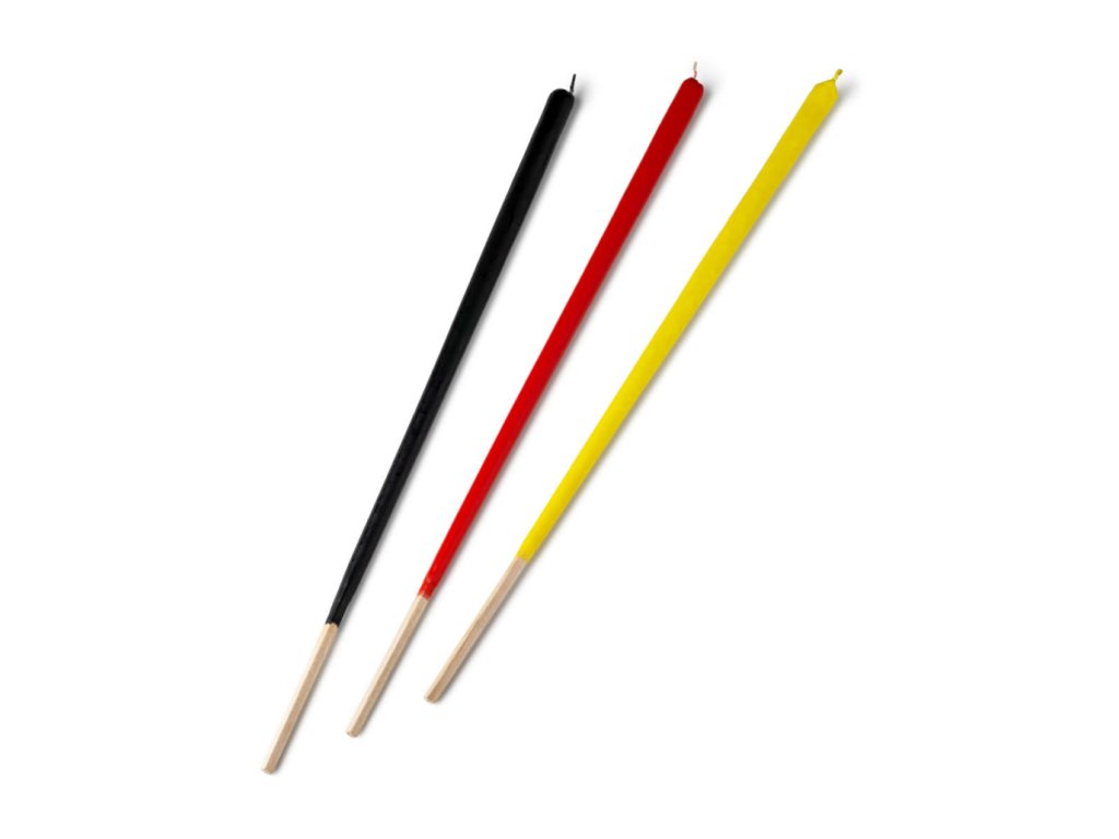 Voskové svíčky v barvách: červená, žlutá, černá. Ideální pro zahradní párty. Doba hoření až 80 minut (silně závisí na vnějších faktorech).
