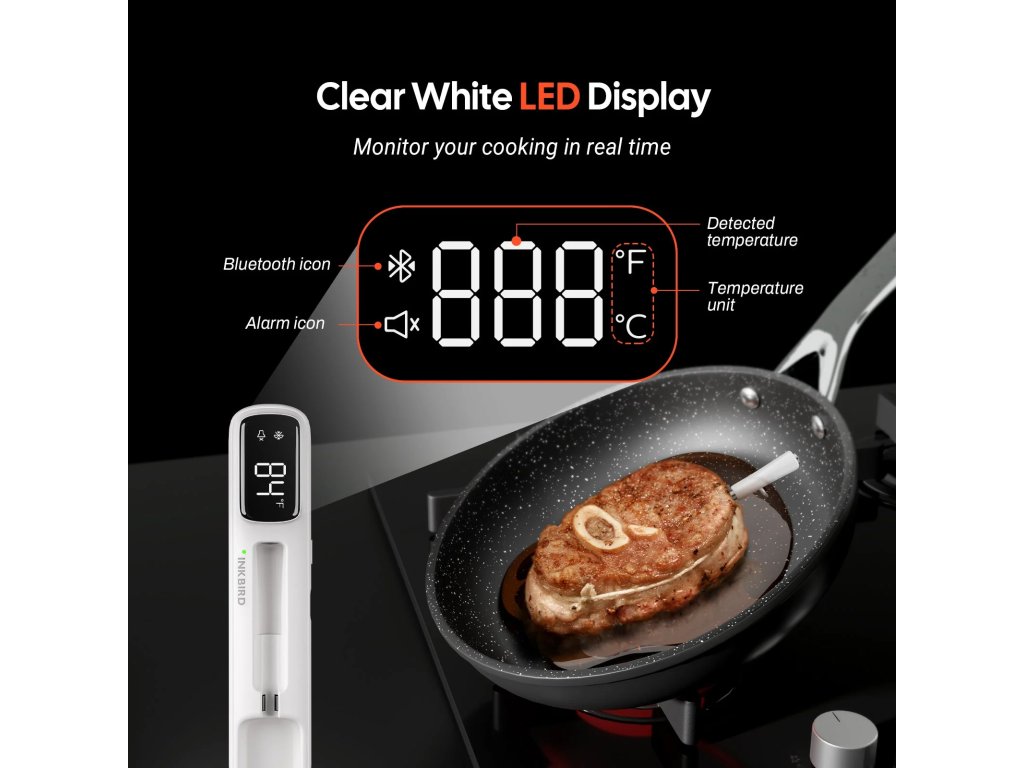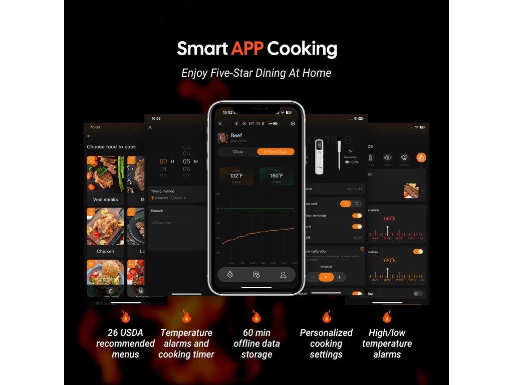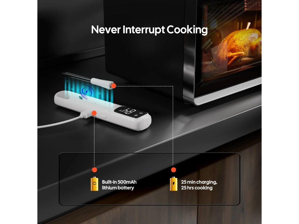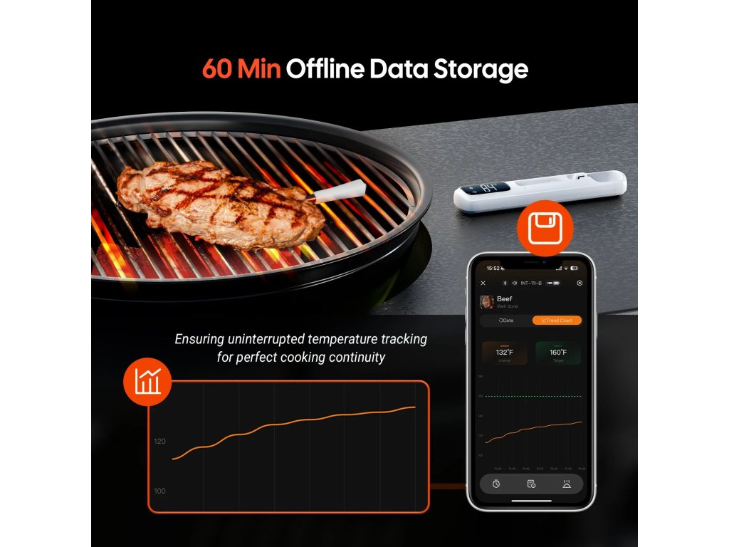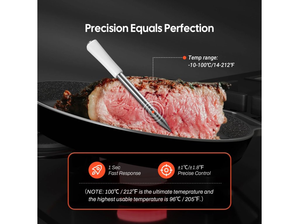 Sonda z nerezové oceli obsahuje vysoce přesný senzor, který detekuje změny teploty do 1 sekundy s přesností ±1 ℃. Chytrá základna automaticky ukládá 60 minut offline dat, která se po opětovném připojení synchronizují s aplikací. Aplikace nabízí 26 přednastavených masových menu dle doporučení USDA.
