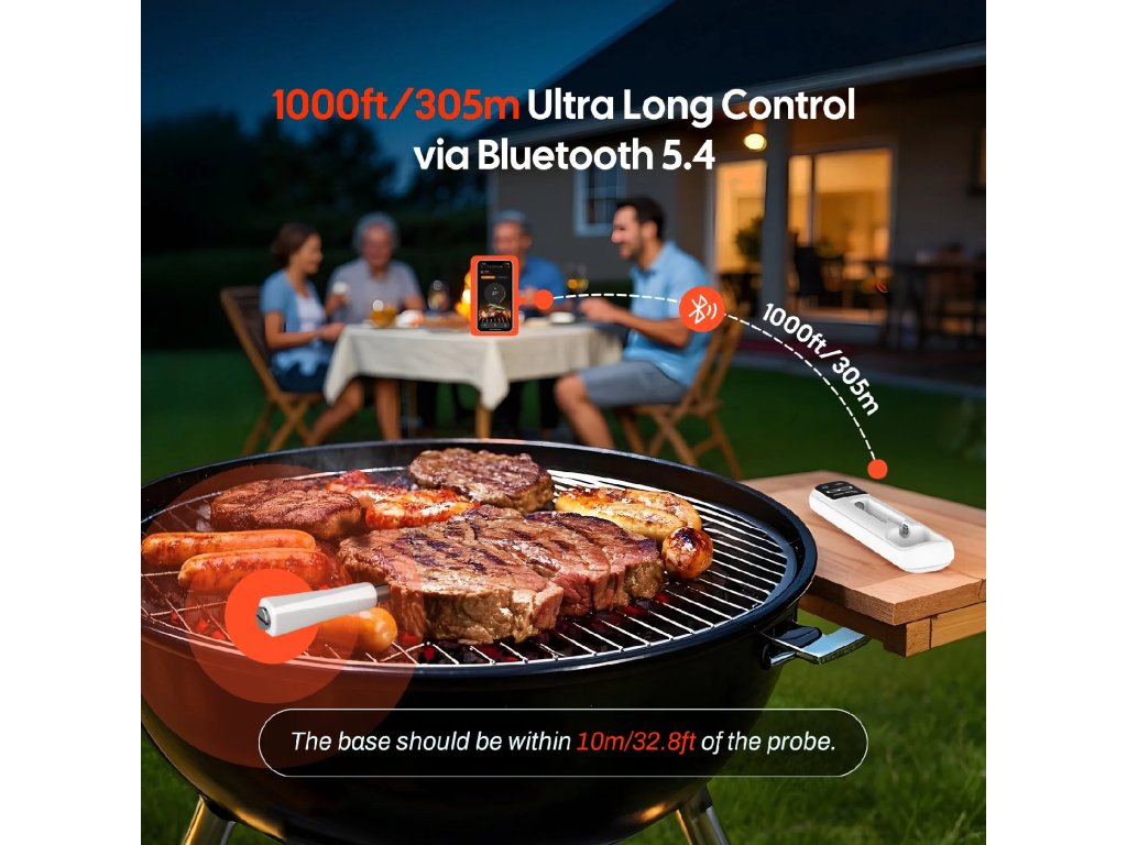 Špičková technologie Bluetooth 5.4 dosahuje průlomového dosahu dálkového ovládání až 305 m. Volně se pohybujte mezi grilem na zahradě a vnitřní kuchyní, zatímco si udržujete absolutní kontrolu nad teplotou.