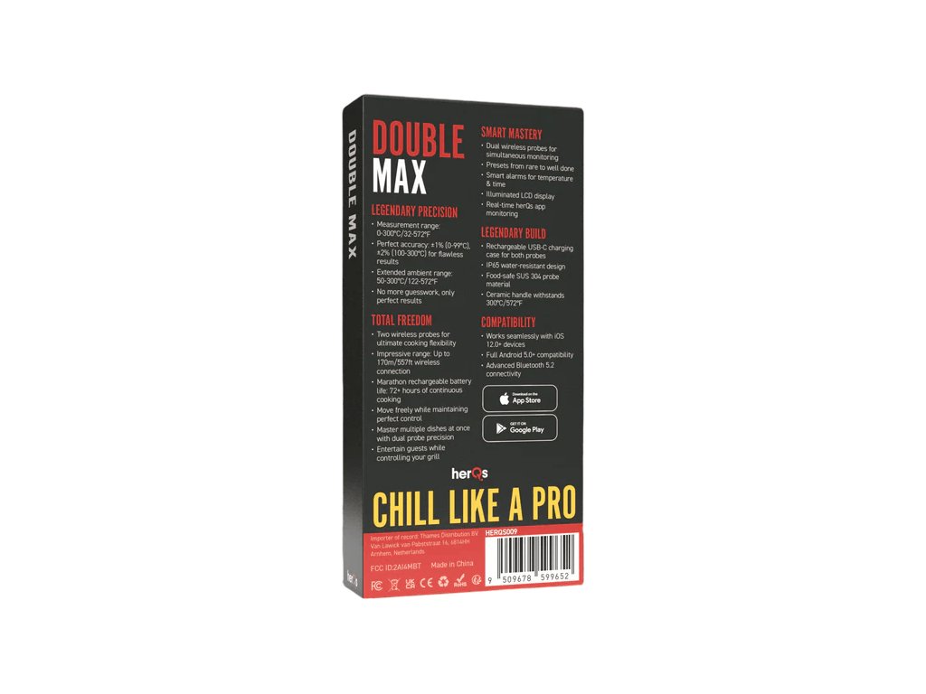 Tento bezdrátový teploměr je dodáván se dvěma ultratenkými sondami, takže můžete sledovat dva kusy masa současně – s přesností šéfkuchaře a snadností profesionála. Rychlý pohled na telefon nebo chytrý teploměr vám okamžitě řekne, jak se věci mají. Double Max měří teplotu jádra i okolí až do 300 °C a vydrží 72 hodin na sondu. Ideální pro dlouhé grilování, pomalé vaření na nízké teplotě nebo pro rušný grilovací stůl.
