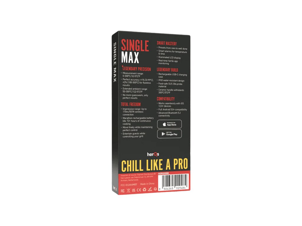 Budíky vás včas upozorní, abyste si mohli odpočinout a užít si večer s přáteli nebo rodinou. Žádný stres, žádné dohady – pokaždé jen dokonale uvařené maso. Díky vodotěsnému provedení s krytím IP65, ultratenké sondě a bezdrátovému dosahu až 170 metrů ve venkovním prostředí je Single Max vaším dokonalým partnerem pro grilování.