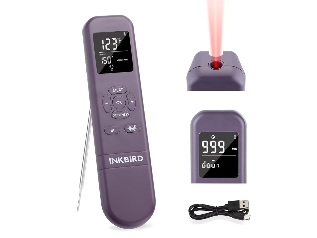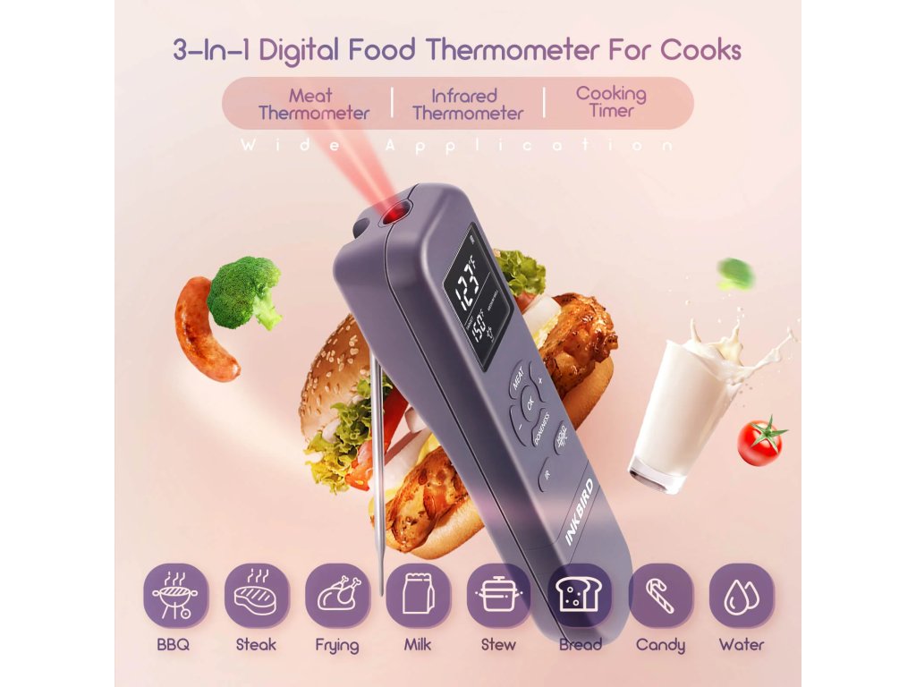 - Digitální teploměr na jídlo s bezkontaktním infračerveným teploměrem a časovačem