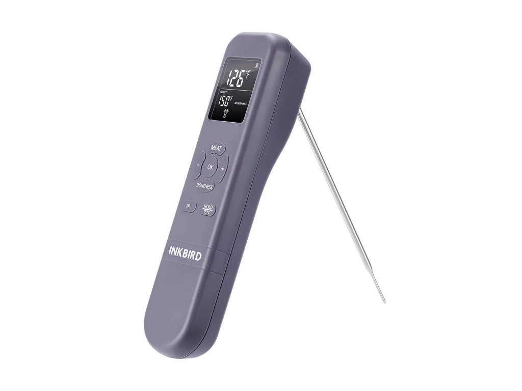 Tento multifunkční teploměr může sloužit jako teploměr na maso, bezkontaktní infračervený teploměr a časovač při vaření. Budeme upozorněni, když dosáhne předem nastavené cílové teploty. Jeho skládací sonda reaguje rychle a je snadno ovladatelná. Měření teploty infračerveným zářením umožňuje měřit teplotu bez dotyku s potravinami, což je bezpečnější a hygieničtější.