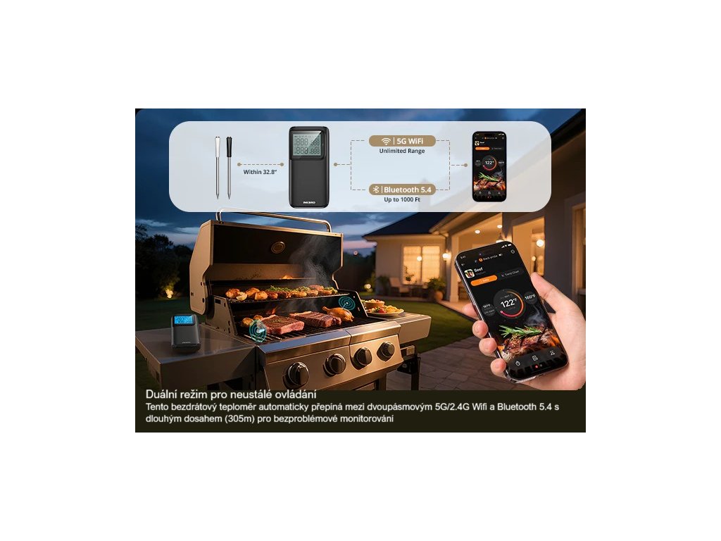 Duální připojení WiFi 5G + Bluetooth 5.4Tento bezdrátový teploměr na grilování nabízí dvoupásmové připojení WiFi 5G a 2.4G a Bluetooth 5.4 pro bezproblémové sledování. Doma můžete bez námahy sledovat svou kuchyňskou práci z ultra dlouhé vzdálenosti Bluetooth 305 m. Venku se automaticky přepne na připojení WiFi, takže vám nic neunikne.