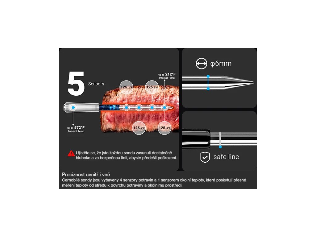 5 vysoce přesných senzorů v obou sondáchČerná i bílá sonda mají uvnitř zabudováno několik senzorů: 4 senzory potravin a 1 senzor okolní teploty. Měří teploty ve všech rozměrech od středu k povrchu pokrmu, aby umožnily přesnější regulaci teploty. Současným sledováním teploty trouby máte plnou kontrolu nad procesem vaření.