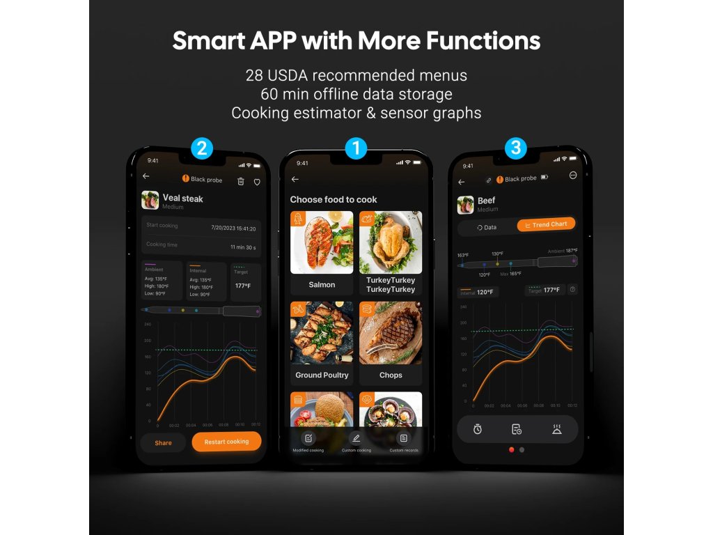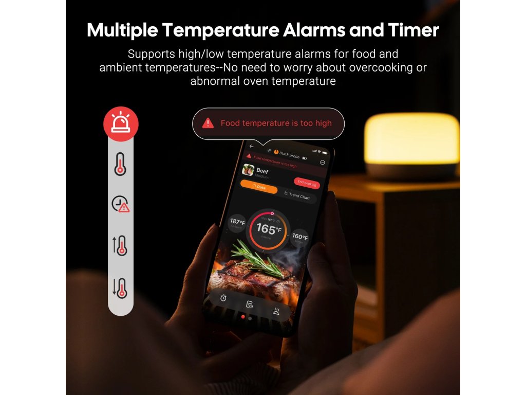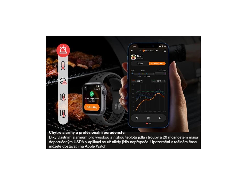 Alarmy vysoké a nízké teploty jídla/troubyChytrá aplikace nabízí 28 možností masa v menu doporučených USDA a obsahuje alarmy vysoké a nízké teploty jídla v reálném čase, stejně jako alarmy vysoké a nízké teploty trouby a další funkce připomenutí.