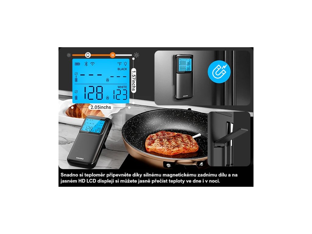 Silný magnet a HD LCD displejDíky silným magnetům na zadní straně lze teploměr snadno připevnit k ledničkám a troubám. Velký, ultra jasný LCD displej s nastavitelným jasem zajišťuje, že všechny teploty jsou viditelné jak na slunci, tak i ve tmě.