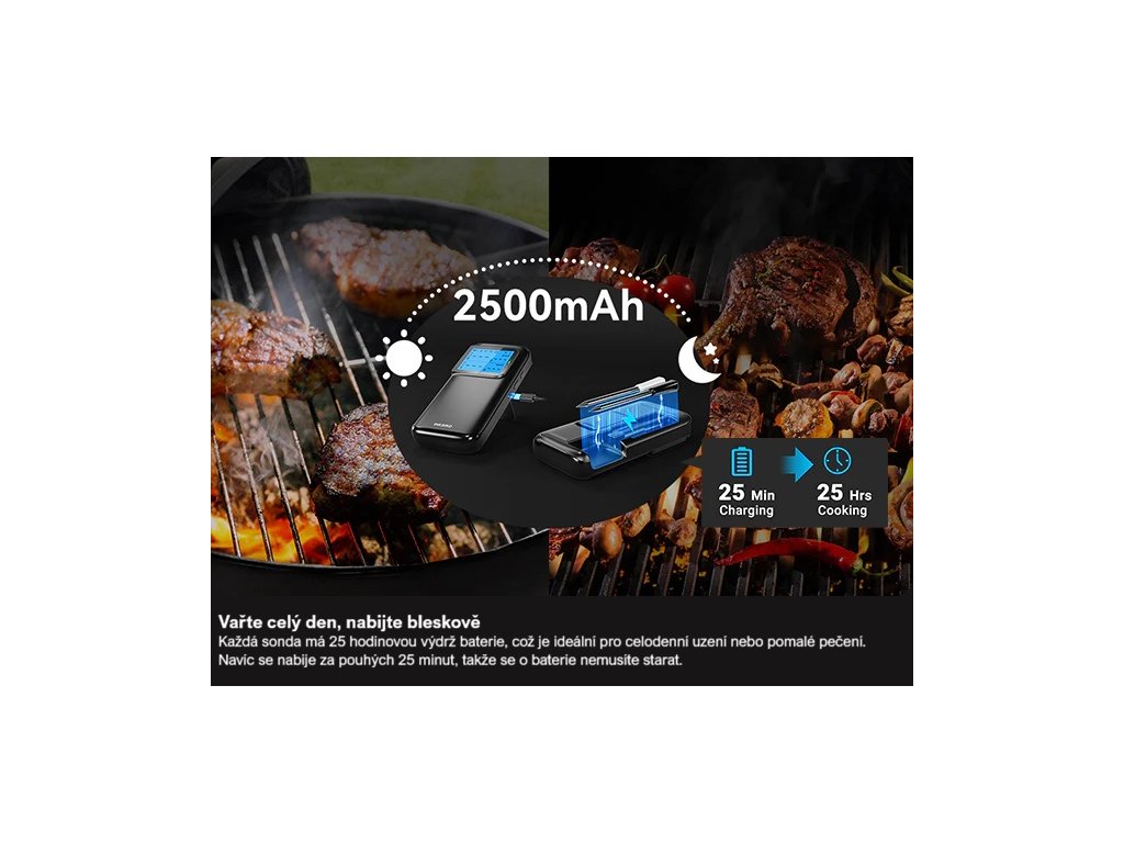 25 hodin vaření, 25 minut nabíjeníKaždá sonda má výdrž baterie 25 hodin pro nepřetržité vaření, což je ideální pro 8 hodin vaření metodou sous vide nebo celodenní uzení. Rychlá doba nabíjení pouhých 25 minut znamená, že můžete zapomenout na starosti s baterií.