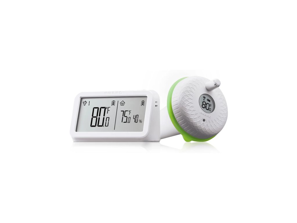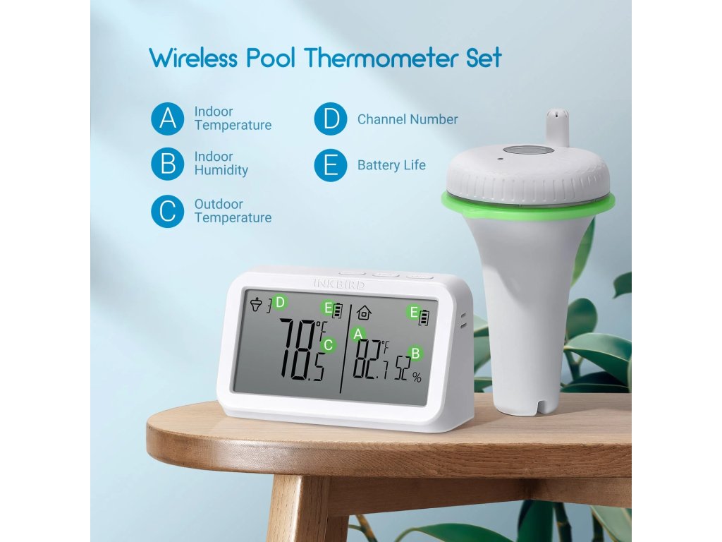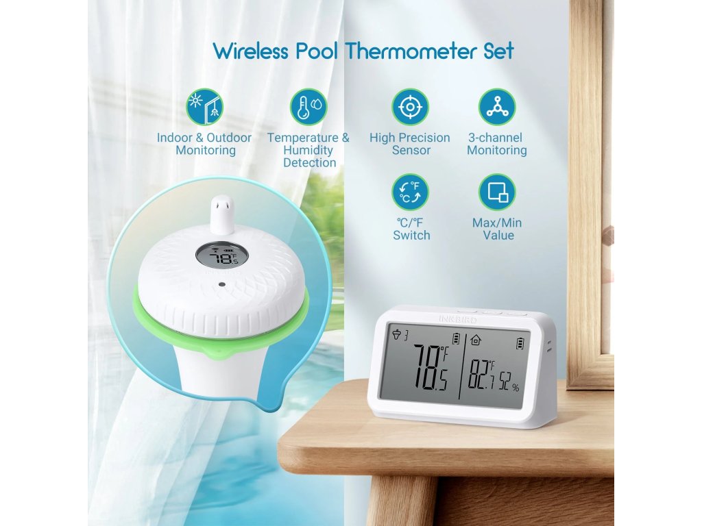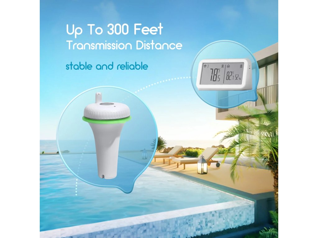 Bezdrátový plovoucí teploměr do bazénu, vířivky, jezírka nebo akvária s vnitřním přijímačem, přesto s přenosem až na ≈ 91 m a možností připojit až tři senzory současně.